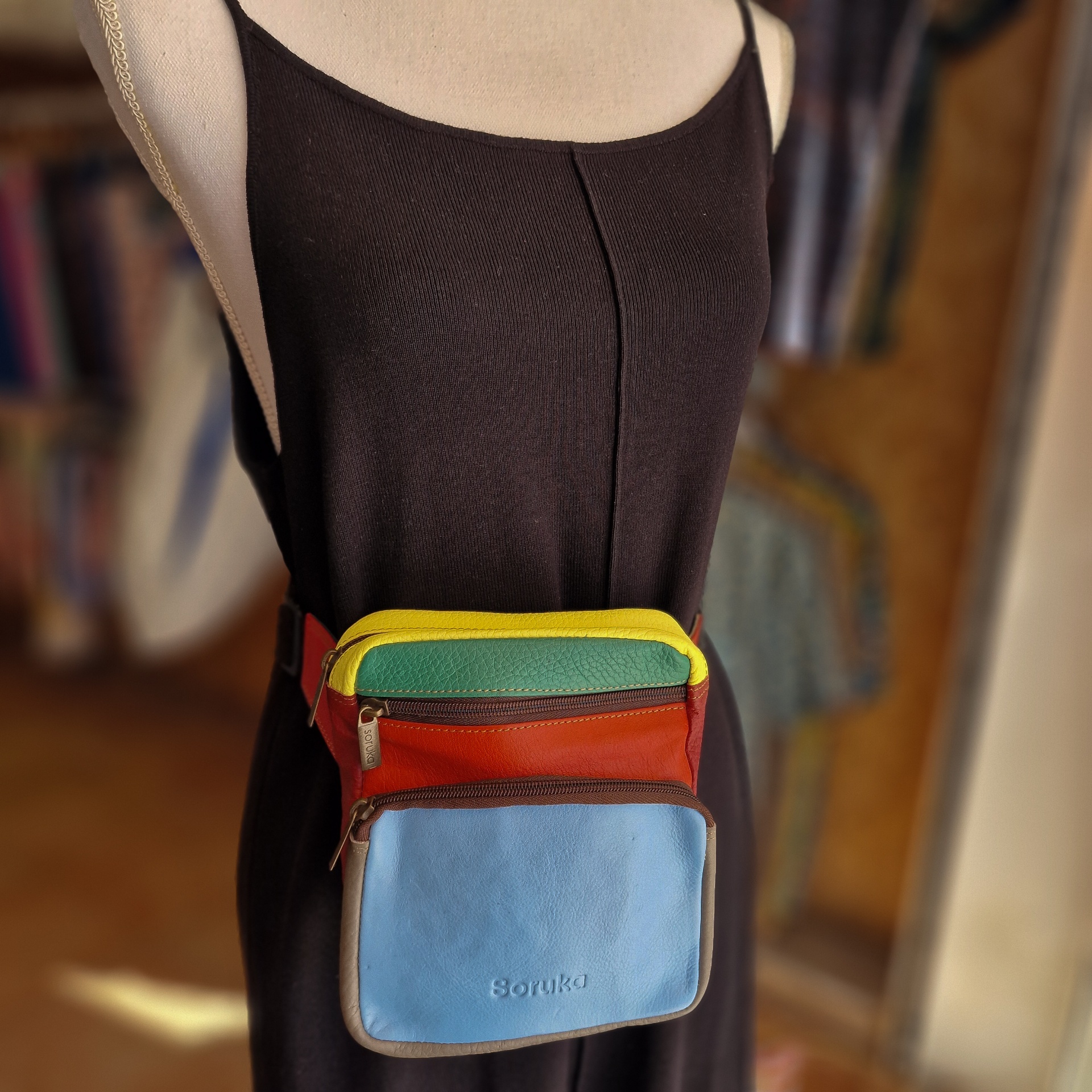 • Bolsa de cintura colorida com três compartimentos sobre vestido preto num manequim