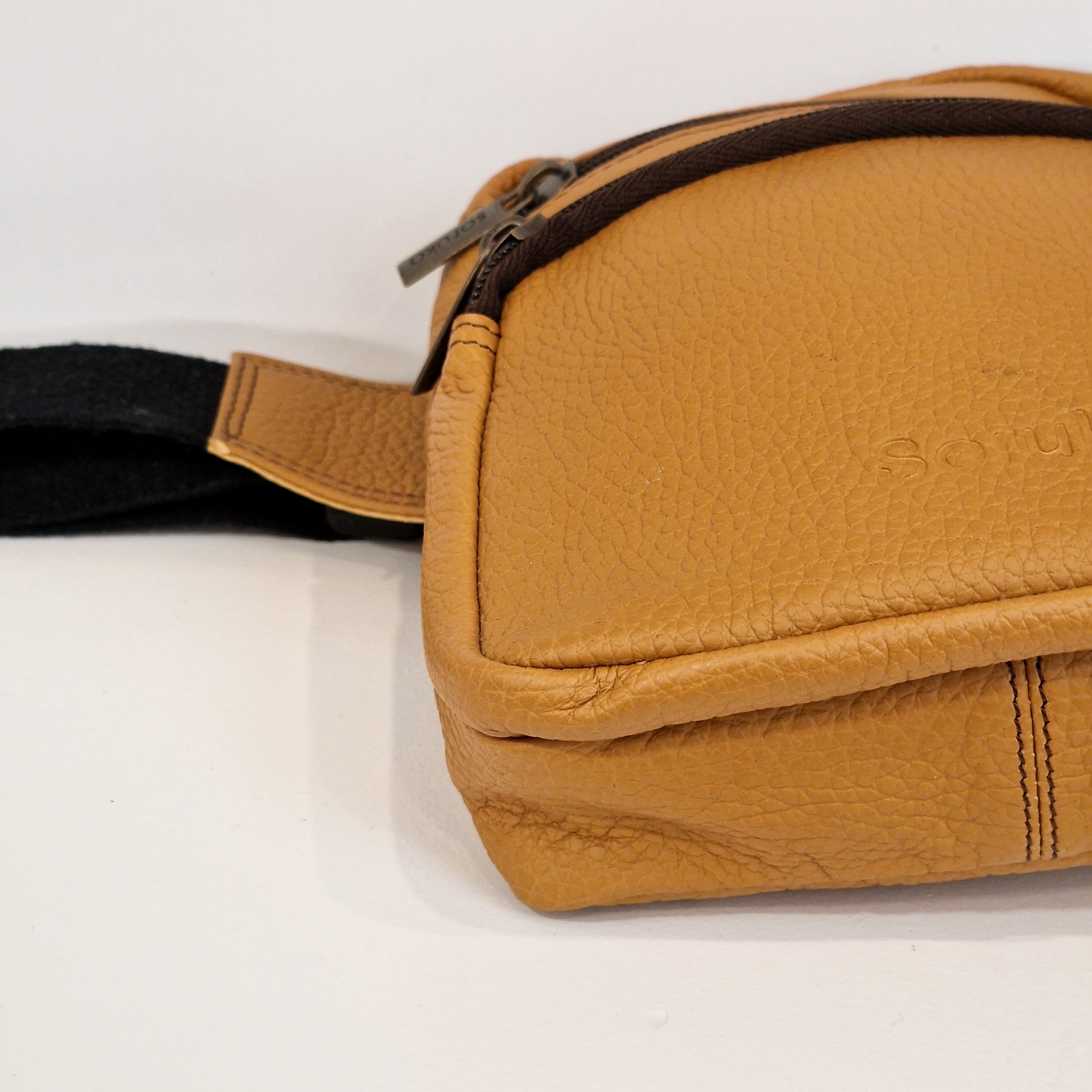 Bolsa de cintura castanha com cintos pretos e fechos de correr