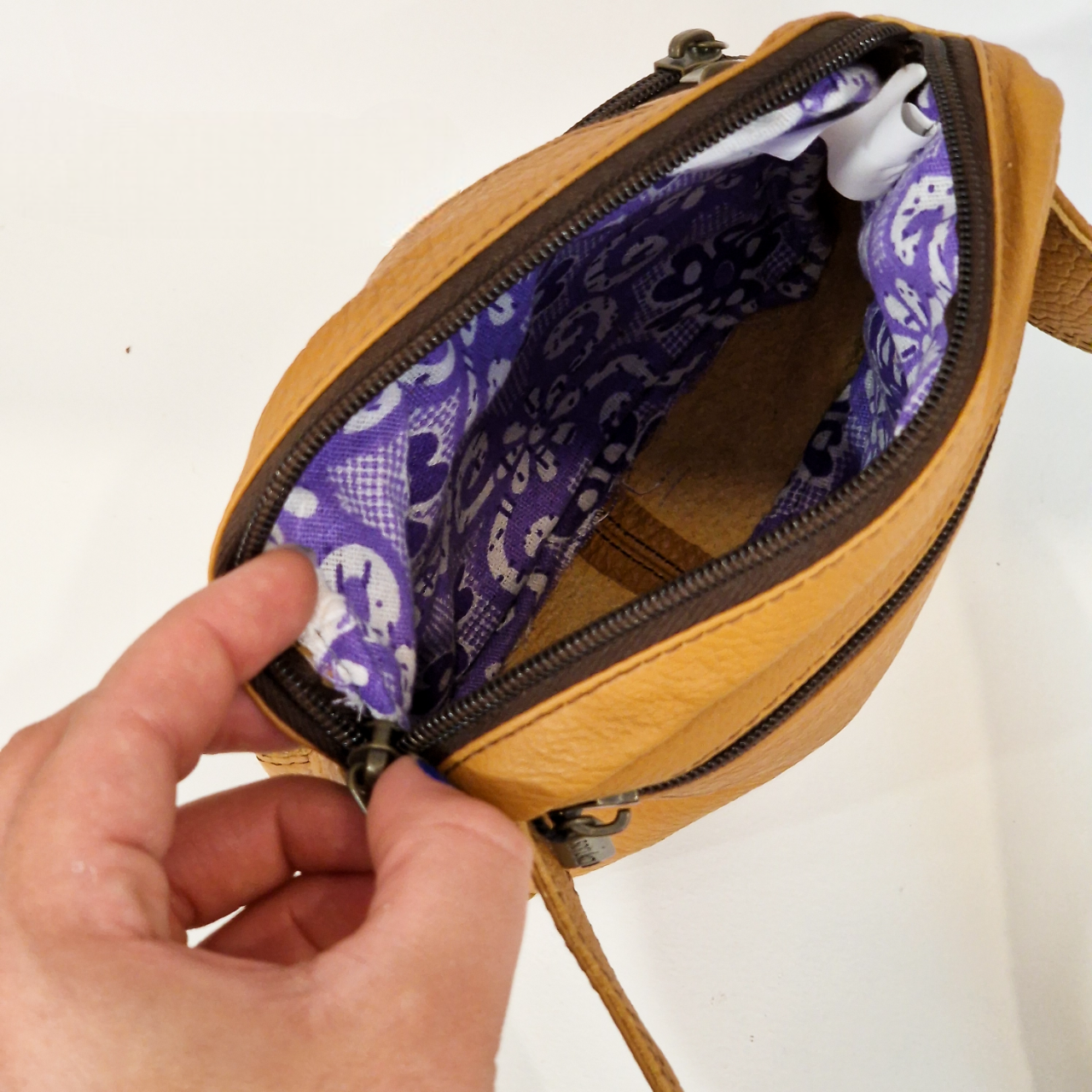 • Carteira ou bolsa pequena de pele castanha aberta mostrando interior colorido