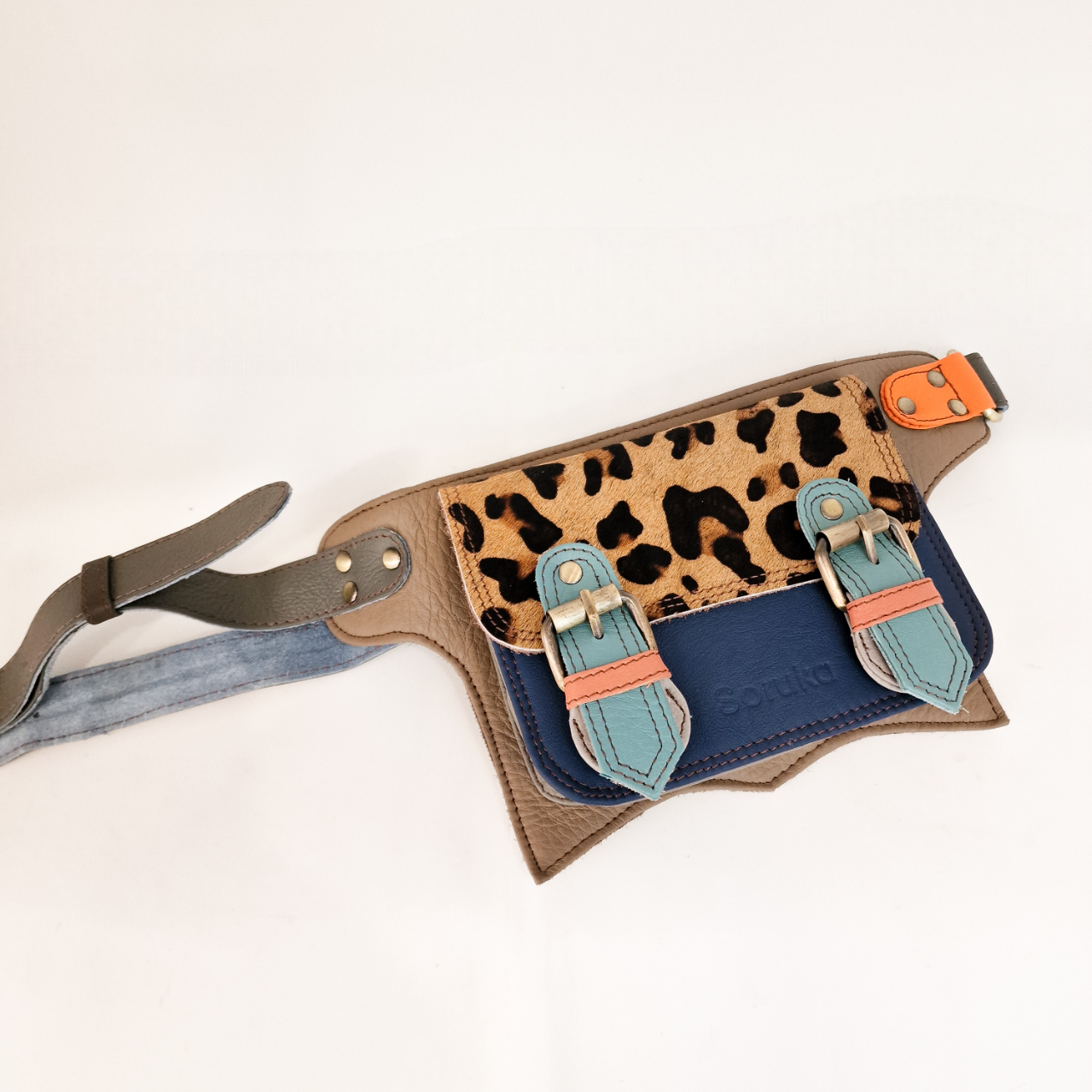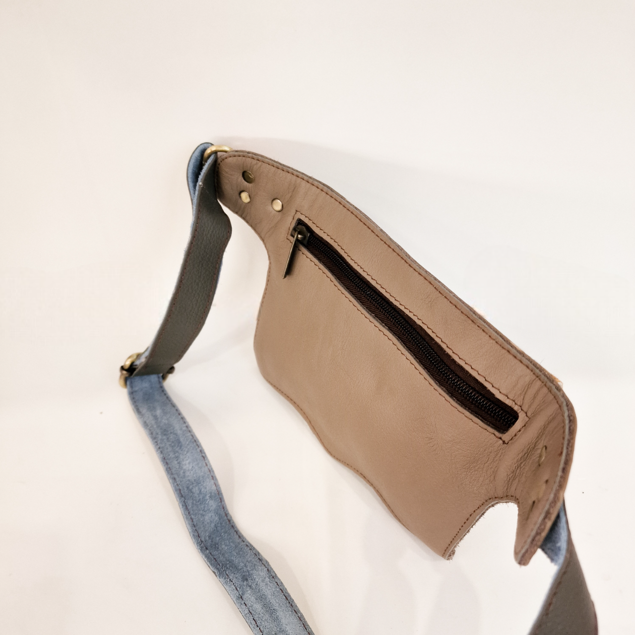 Bolsa de Cintura 100% couro reciclado, com cinto de couro ajustável e extensível.