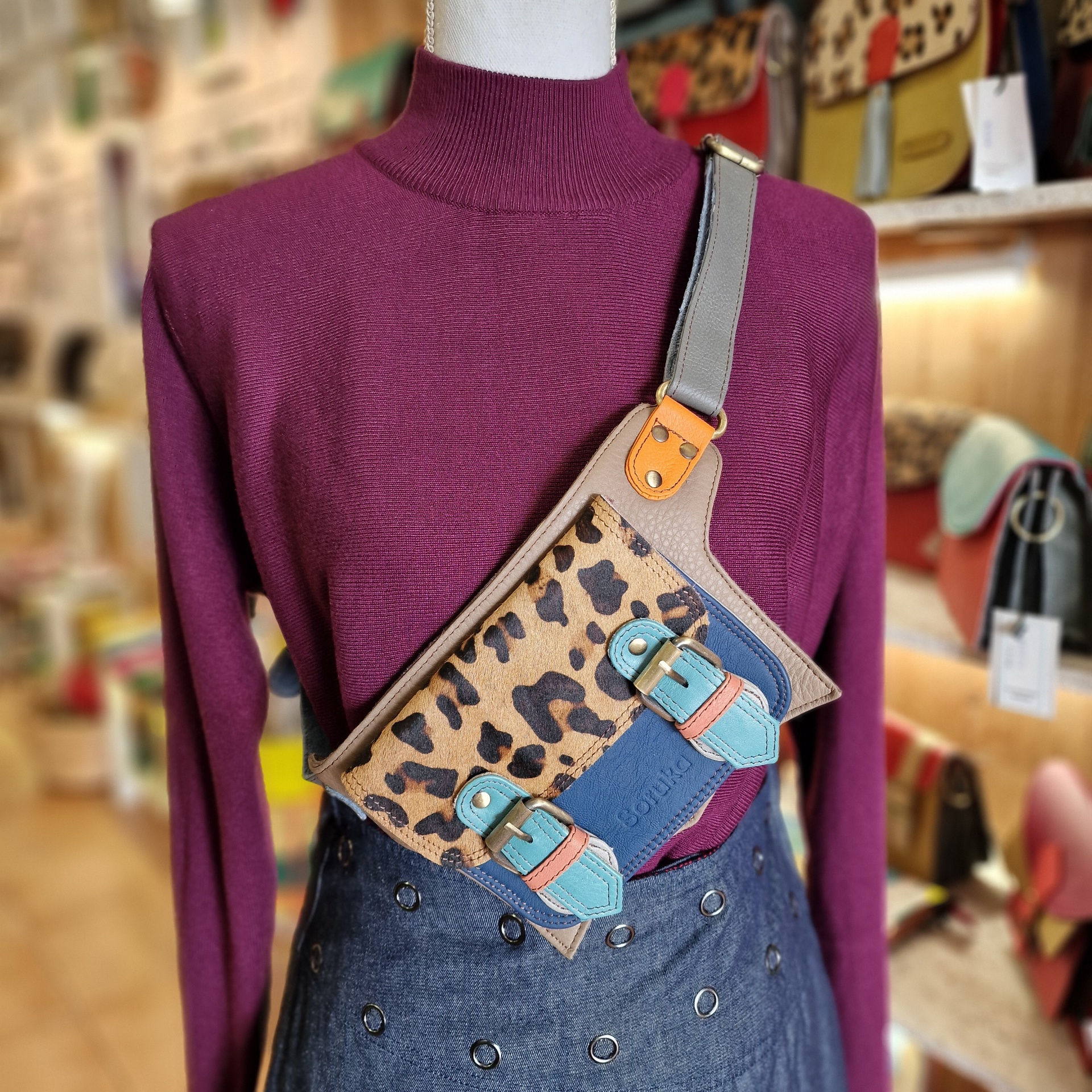 • Bolsa tiracolo animal print com detalhes coloridos numa manequim com camisola roxa e saia azul numa loja