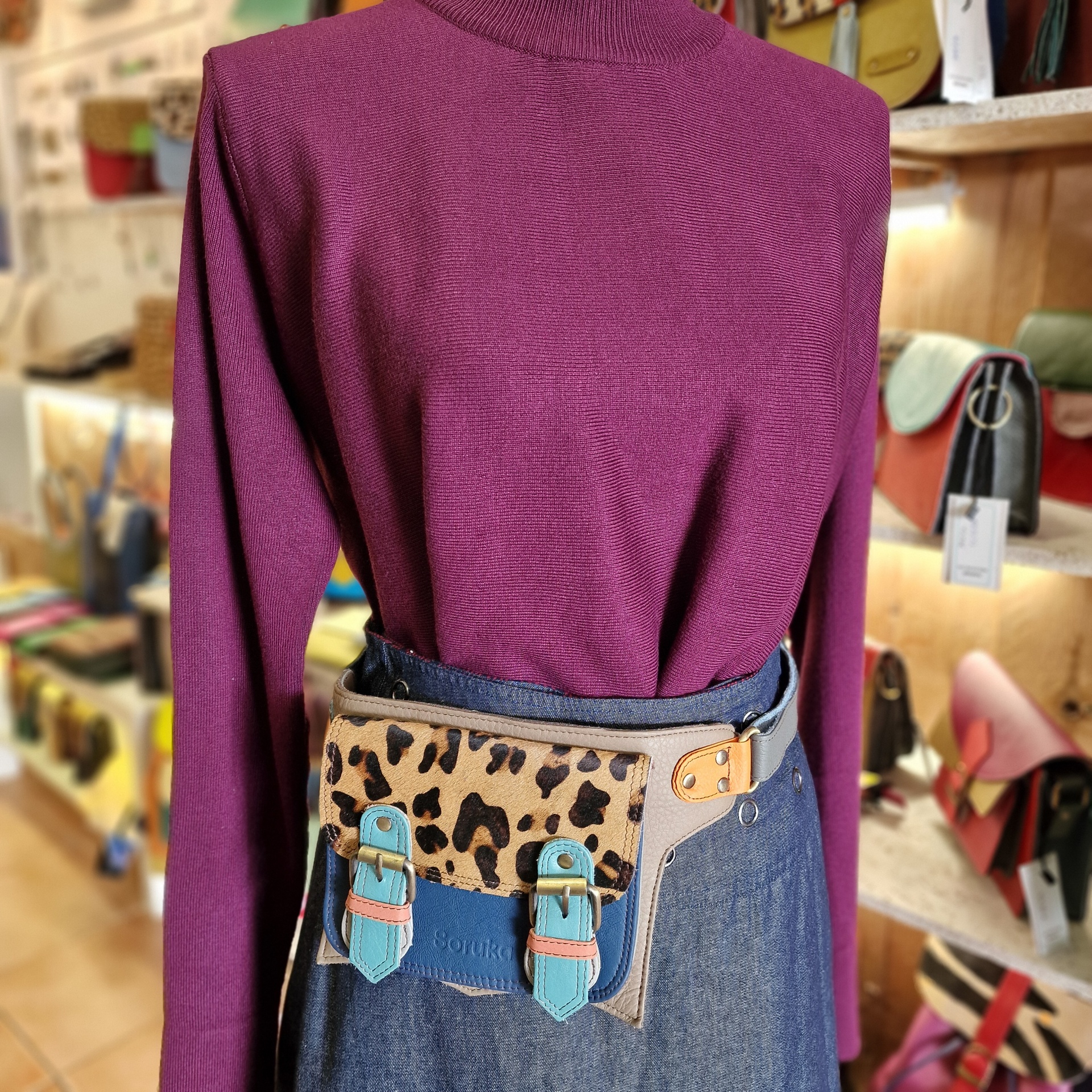 • Bolsa de cintura com padrão leopardo e fivelas turquesa sobre saia jeans e camisola rosa escuro em loja