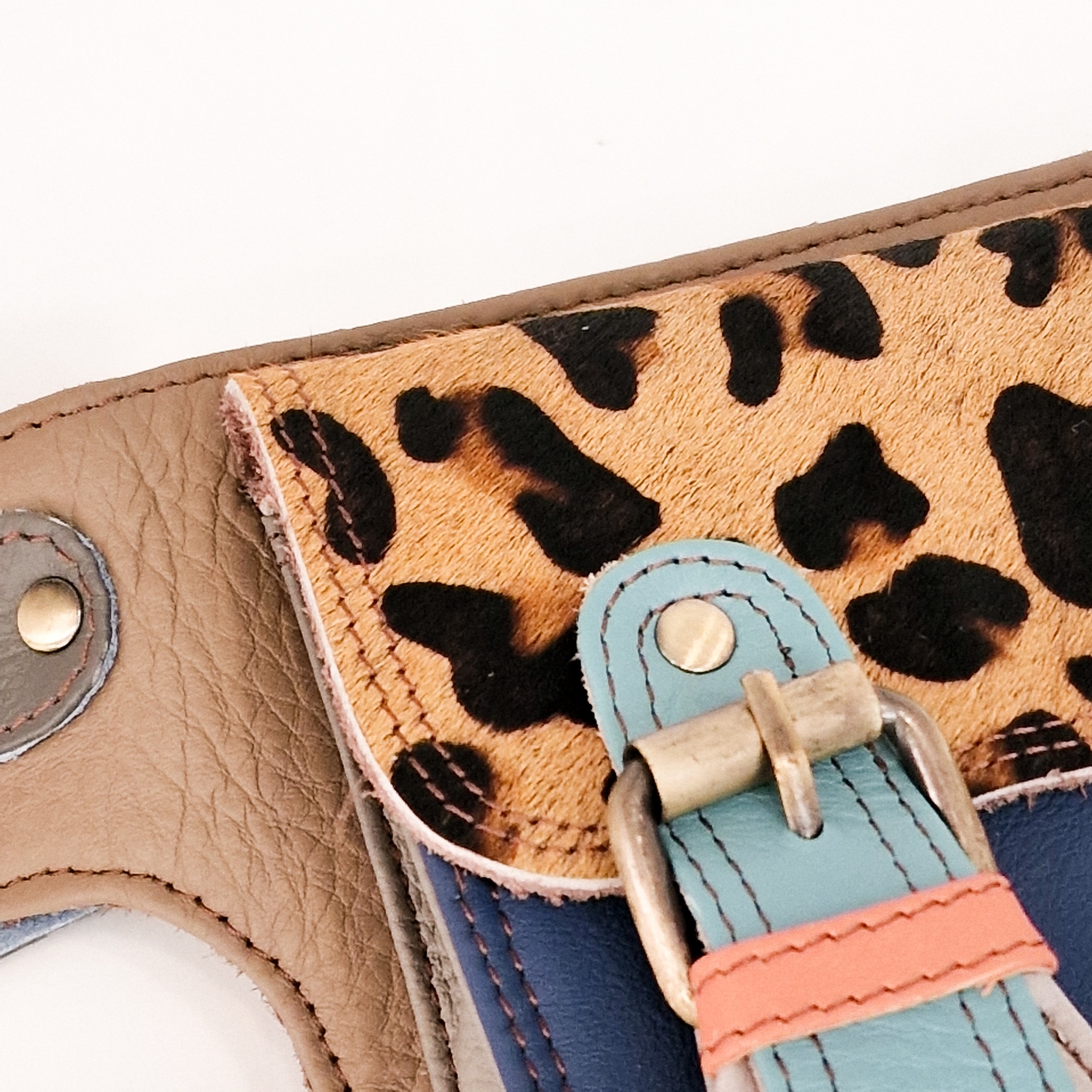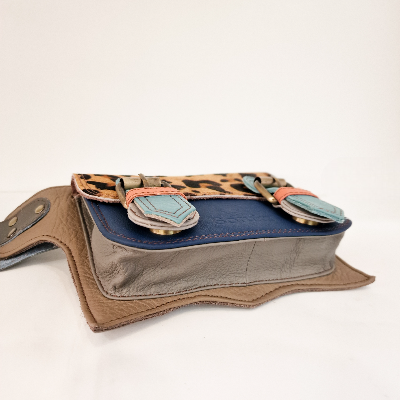 • Bolsa de couro multicolorida com padrão animal print e fivelas metálicas