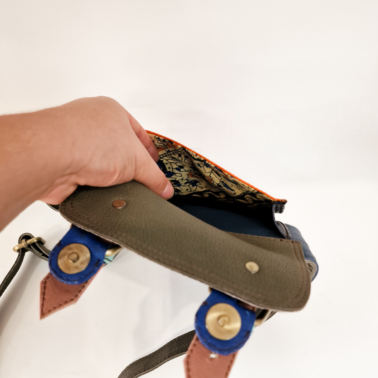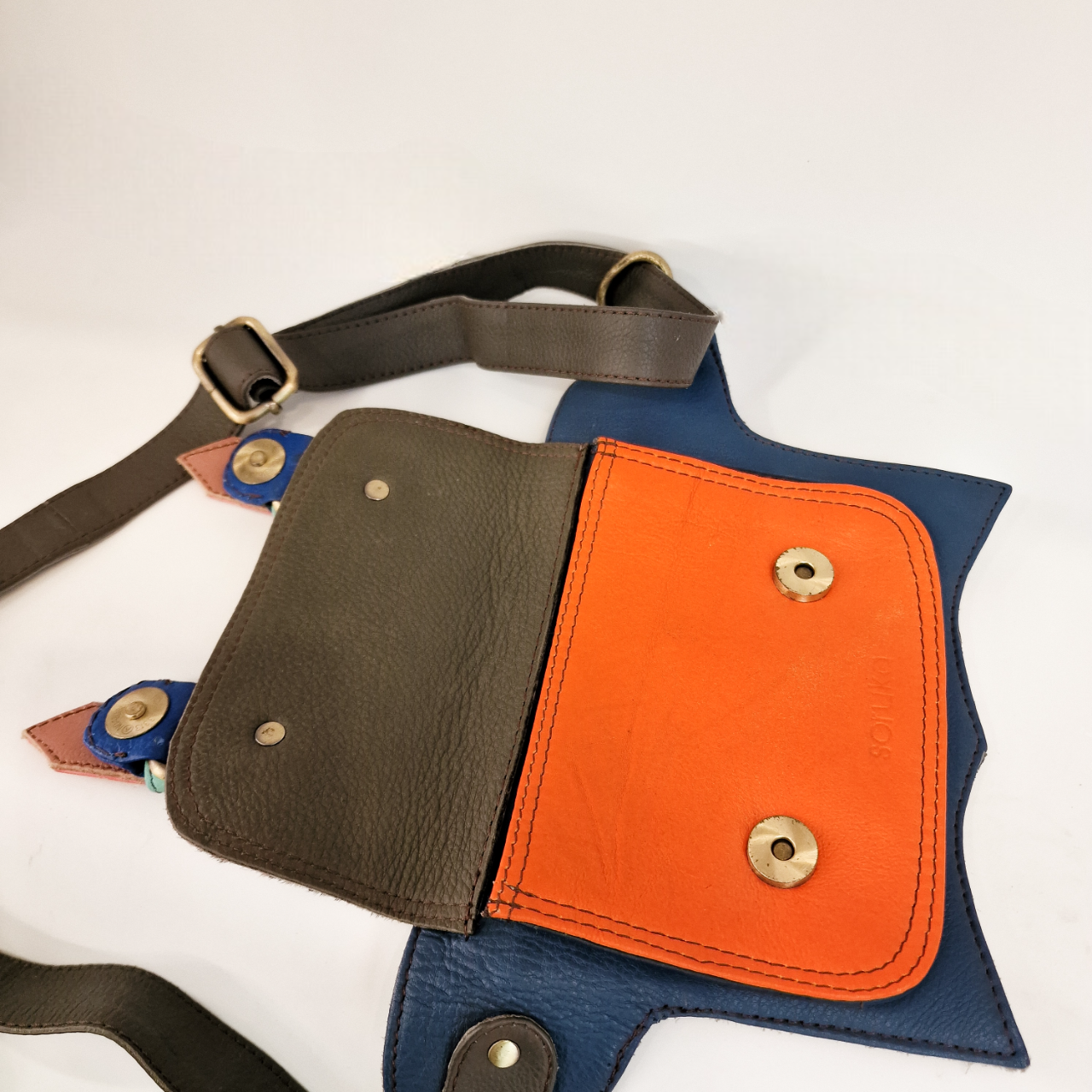 • Mala de ombro azul, laranja e castanho em forma de coruja