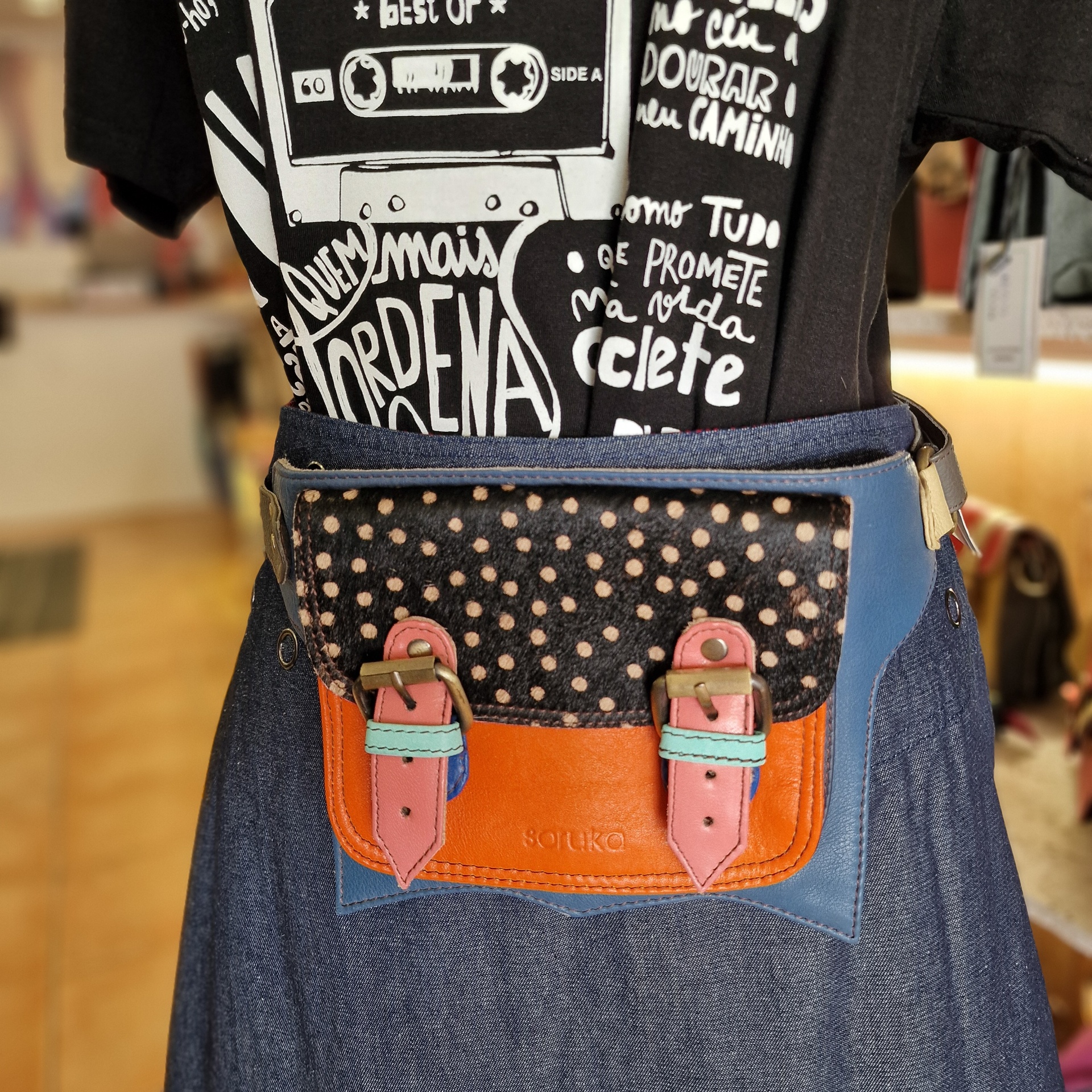 • Cinto com bolso azul, castanho e preto com bolinhas, usado com saia de ganga e t-shirt preta