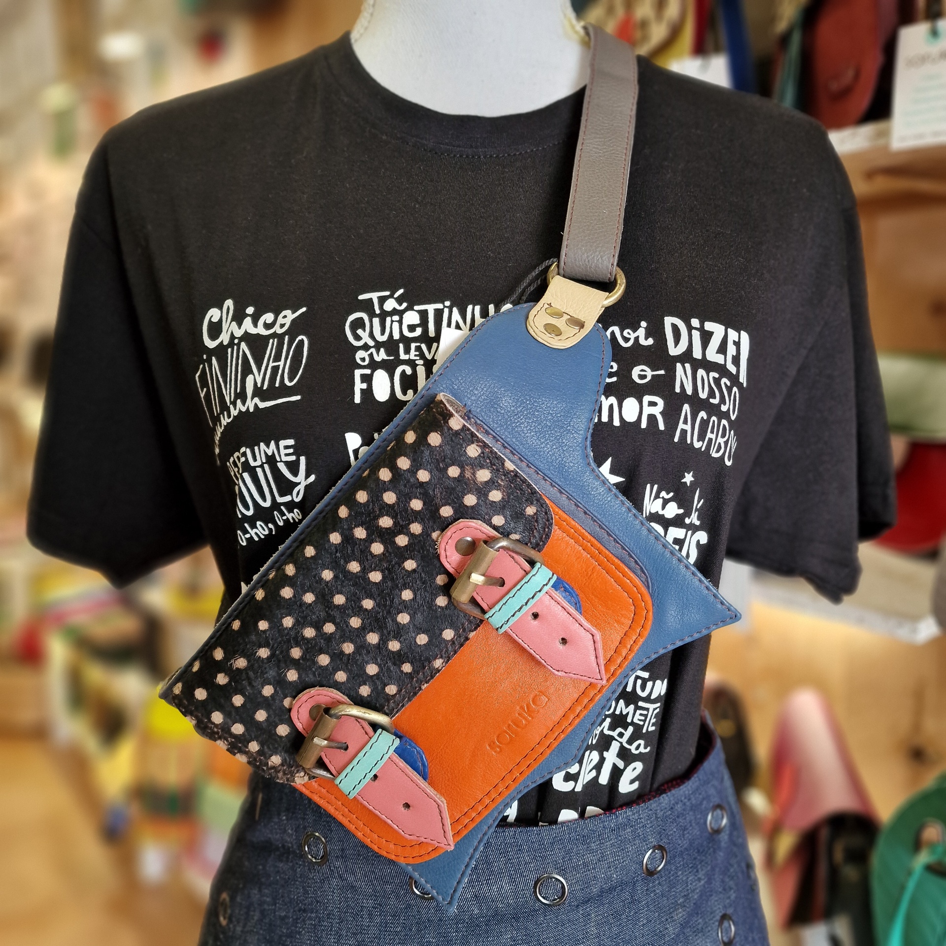 • Bolsa cinto azul com bolso laranja, aba preta com bolinhas, detalhes cor-de-rosa e etiqueta SATCHI