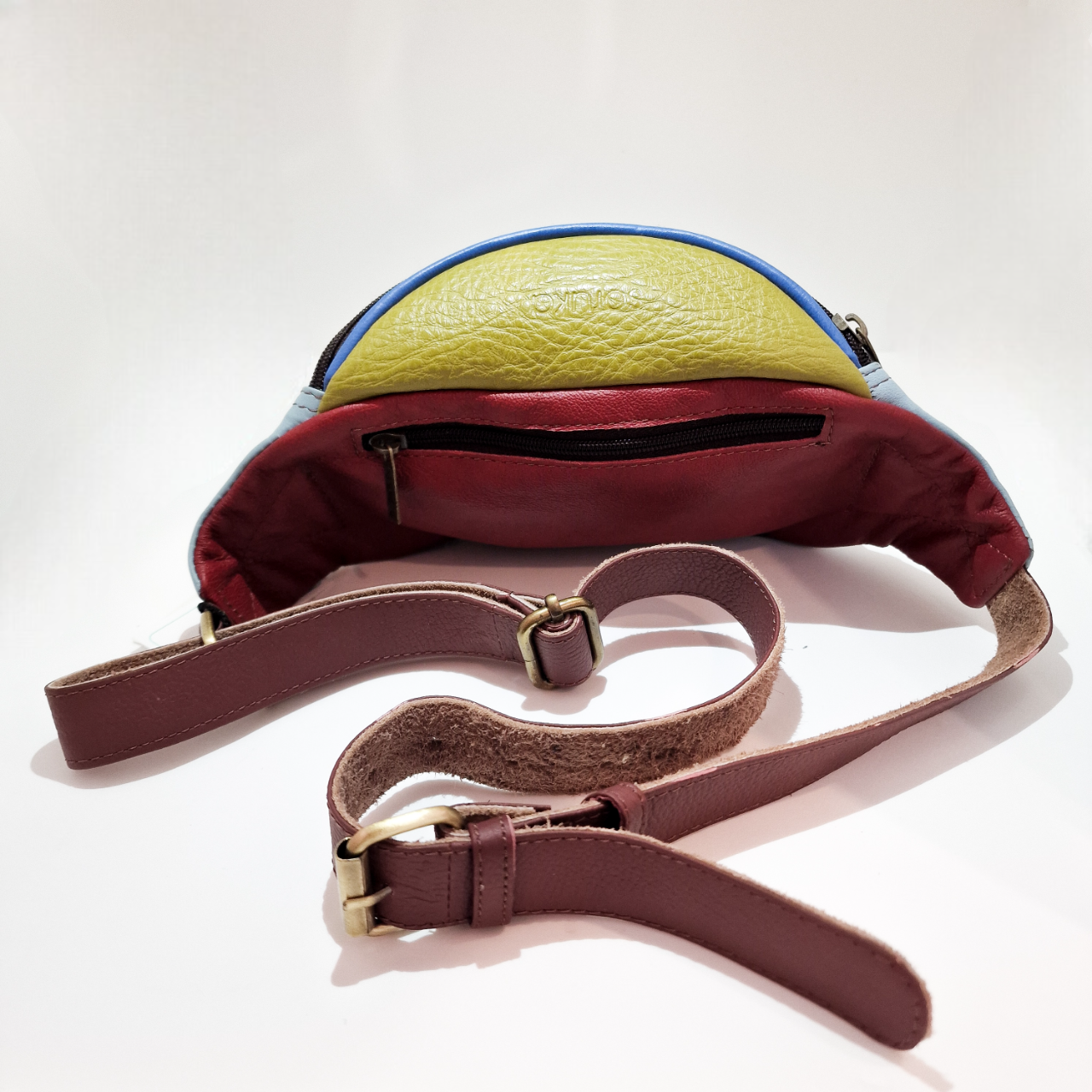 • Bolsa pochete amarela e azul com interior vermelho e alça ajustável castanha
