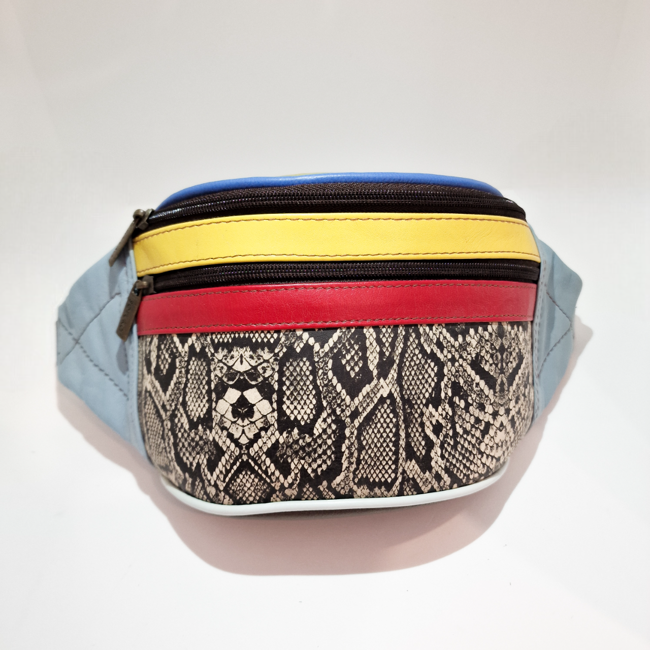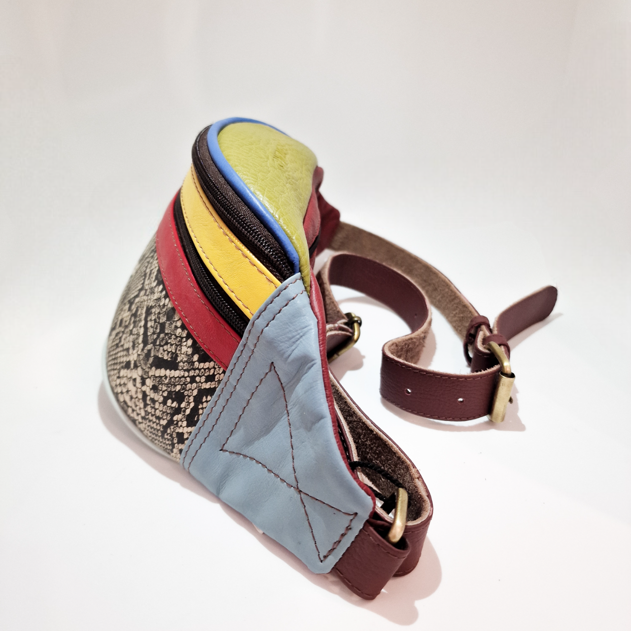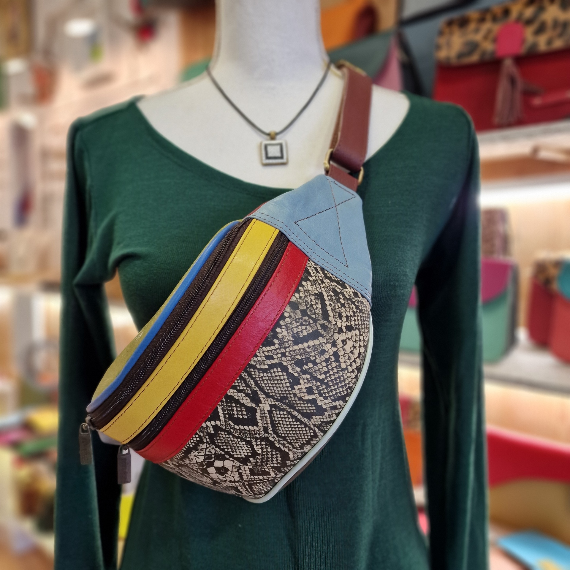 • Bolsa de cintura colorida com padrão pele de cobra e tecido estampado no interior