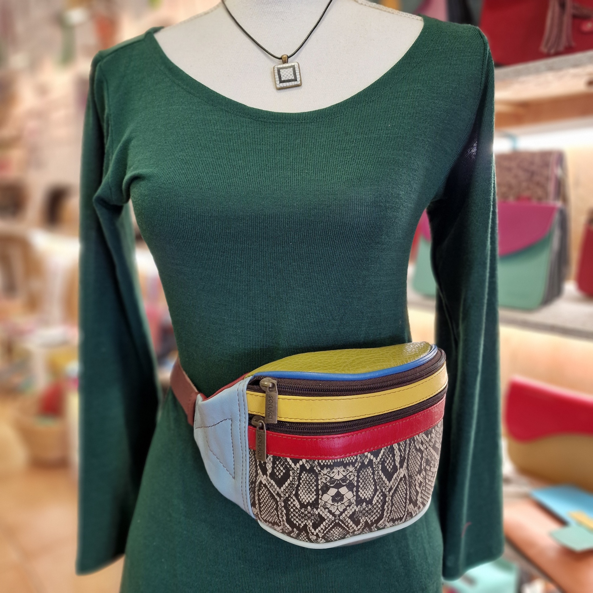 • Mala cintura colorida com padrão pele de cobra e camisola verde num manequim