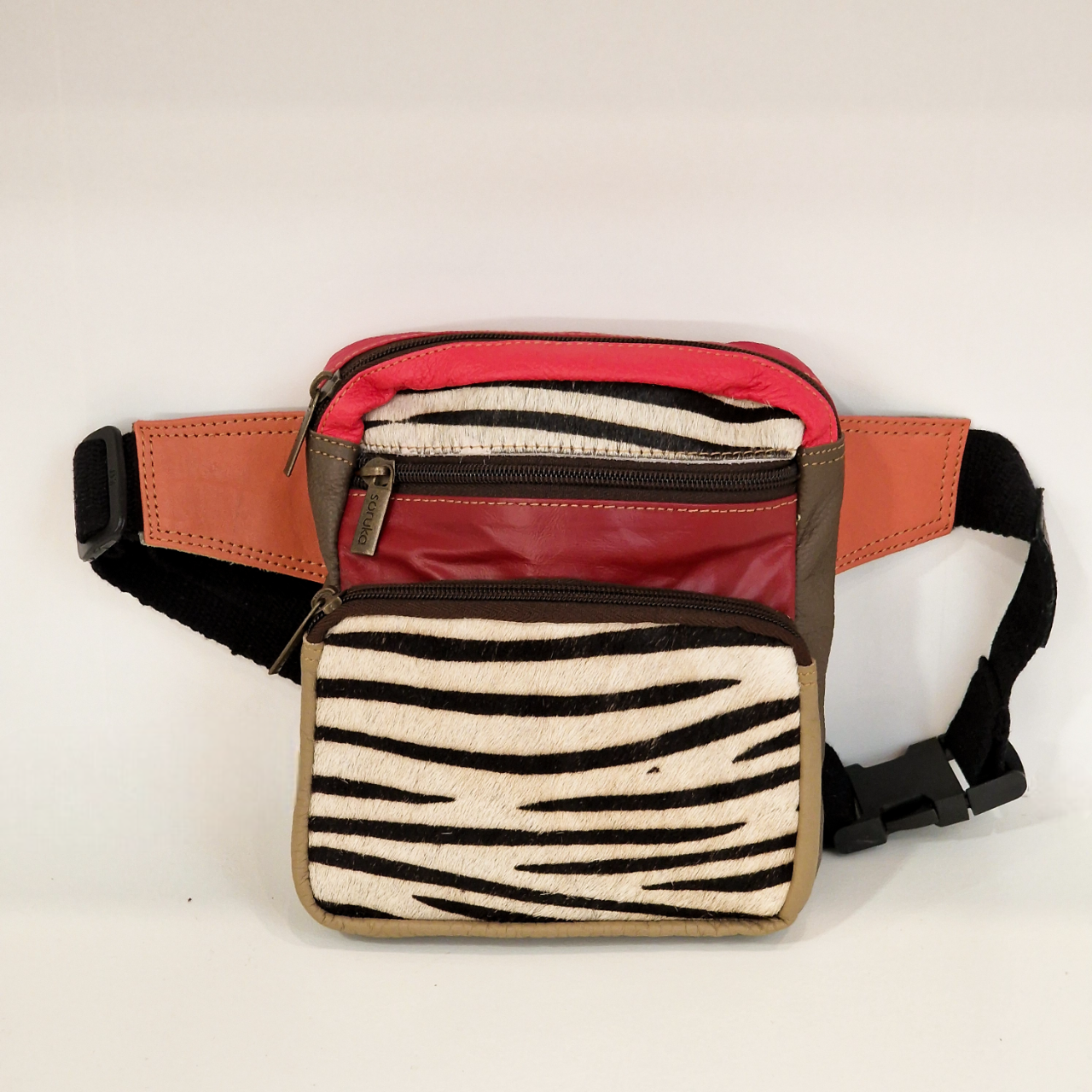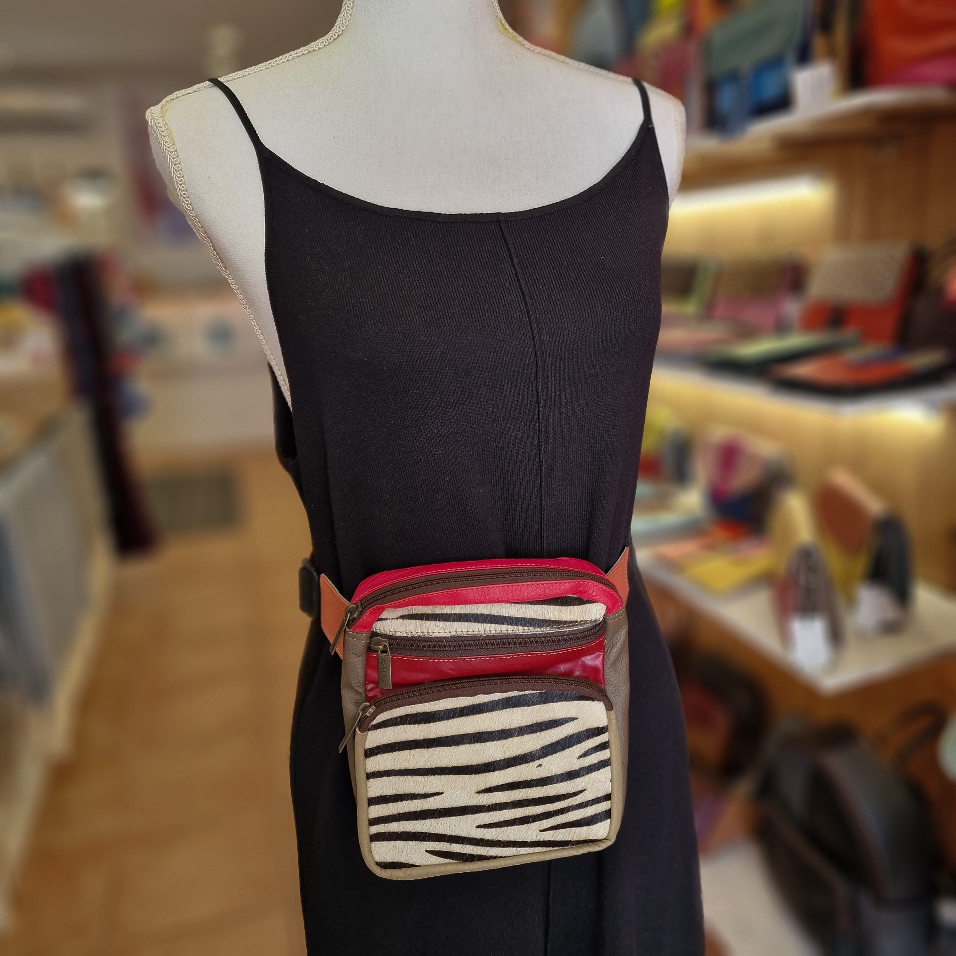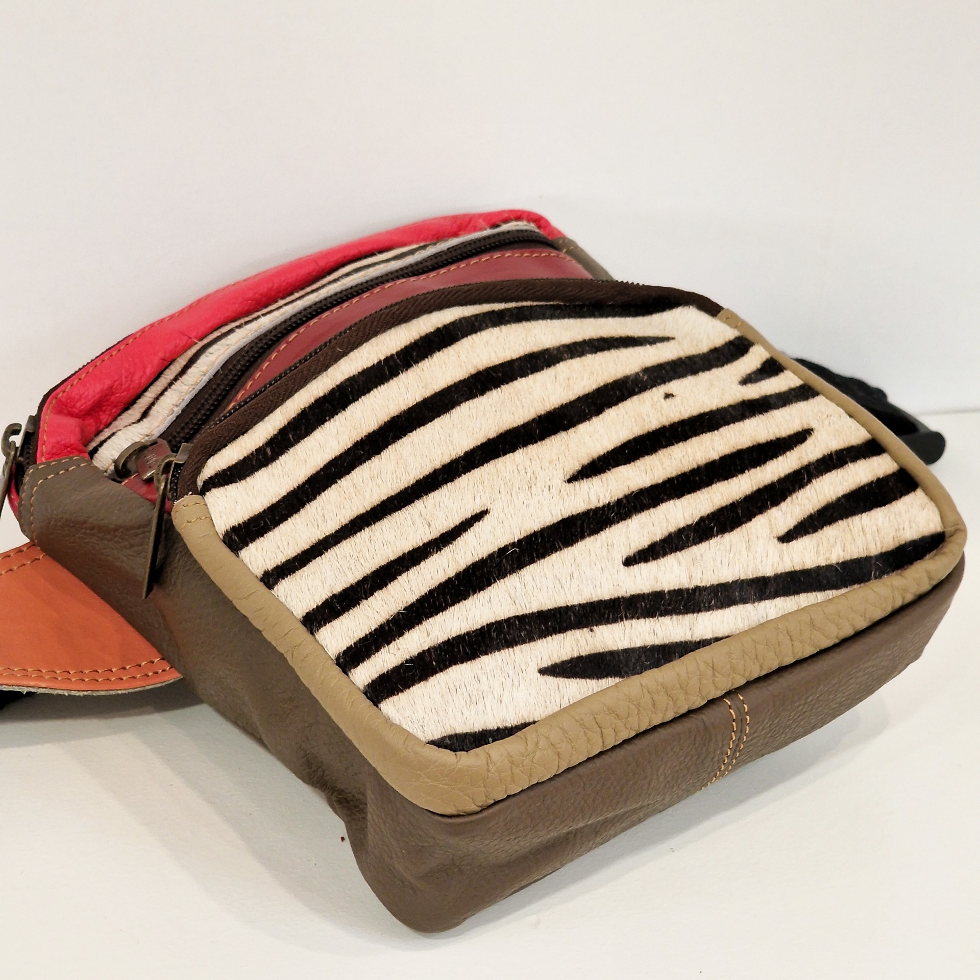 • Bolsa de cintura com padrão zebra e detalhes em pele castanha e vermelha