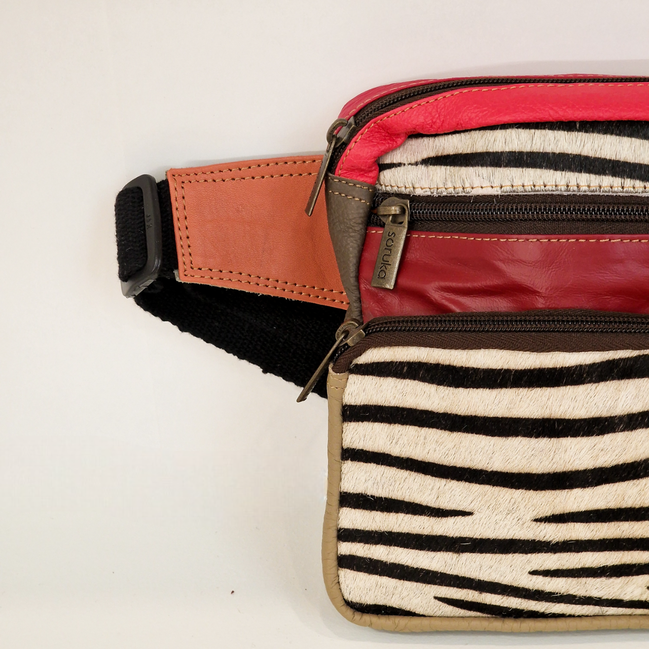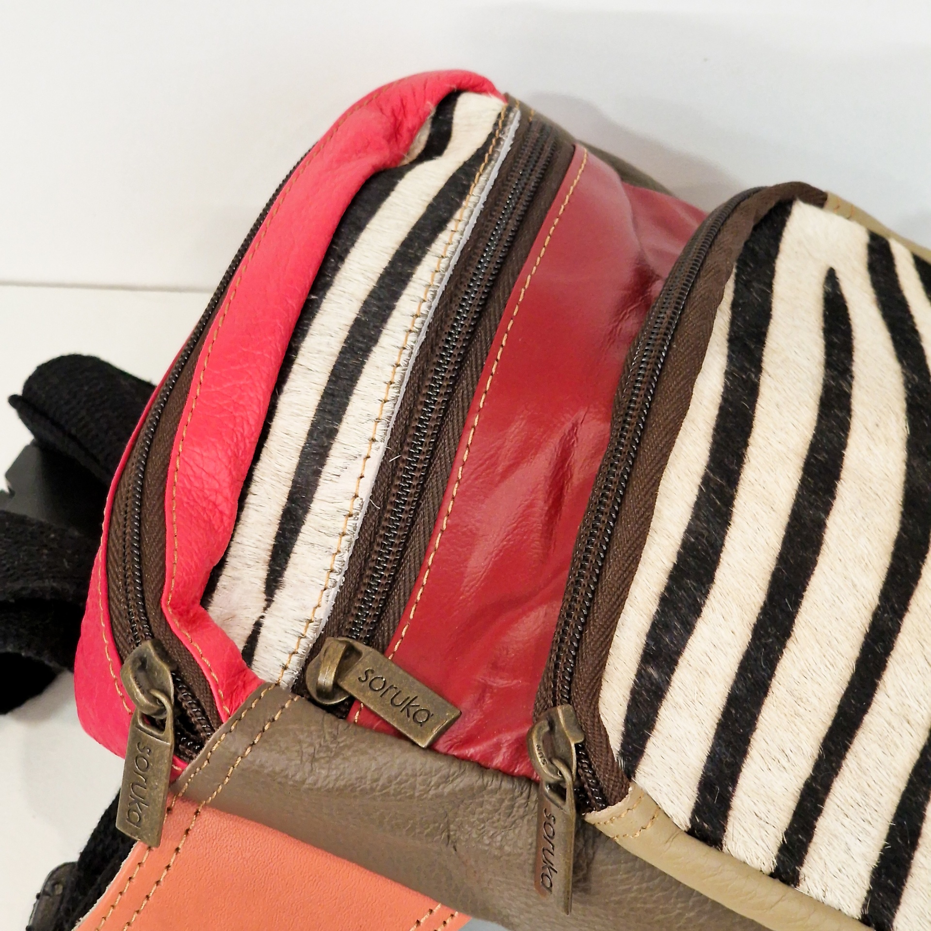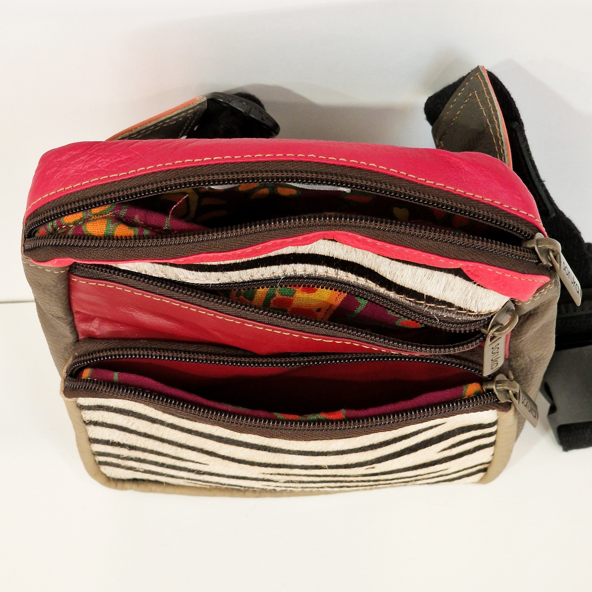 • Bolsa de cintura com padrão zebra e detalhes em pele castanha e vermelha