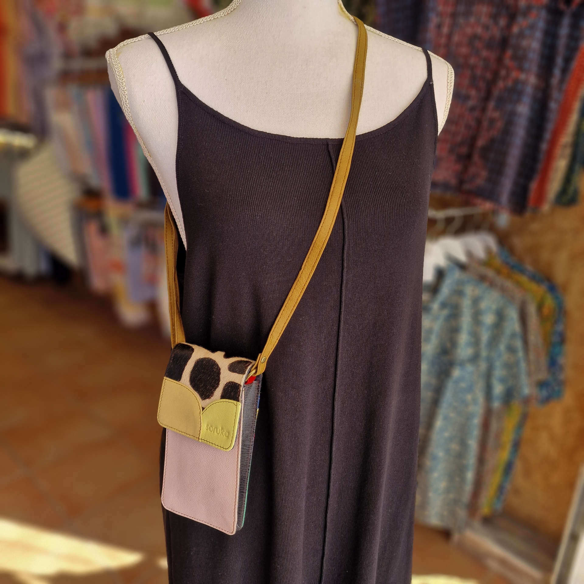Bolsa para telefone com compartimento com fecho, 100% couro reciclado, inclui uma alça de couro ajustável e extensível.