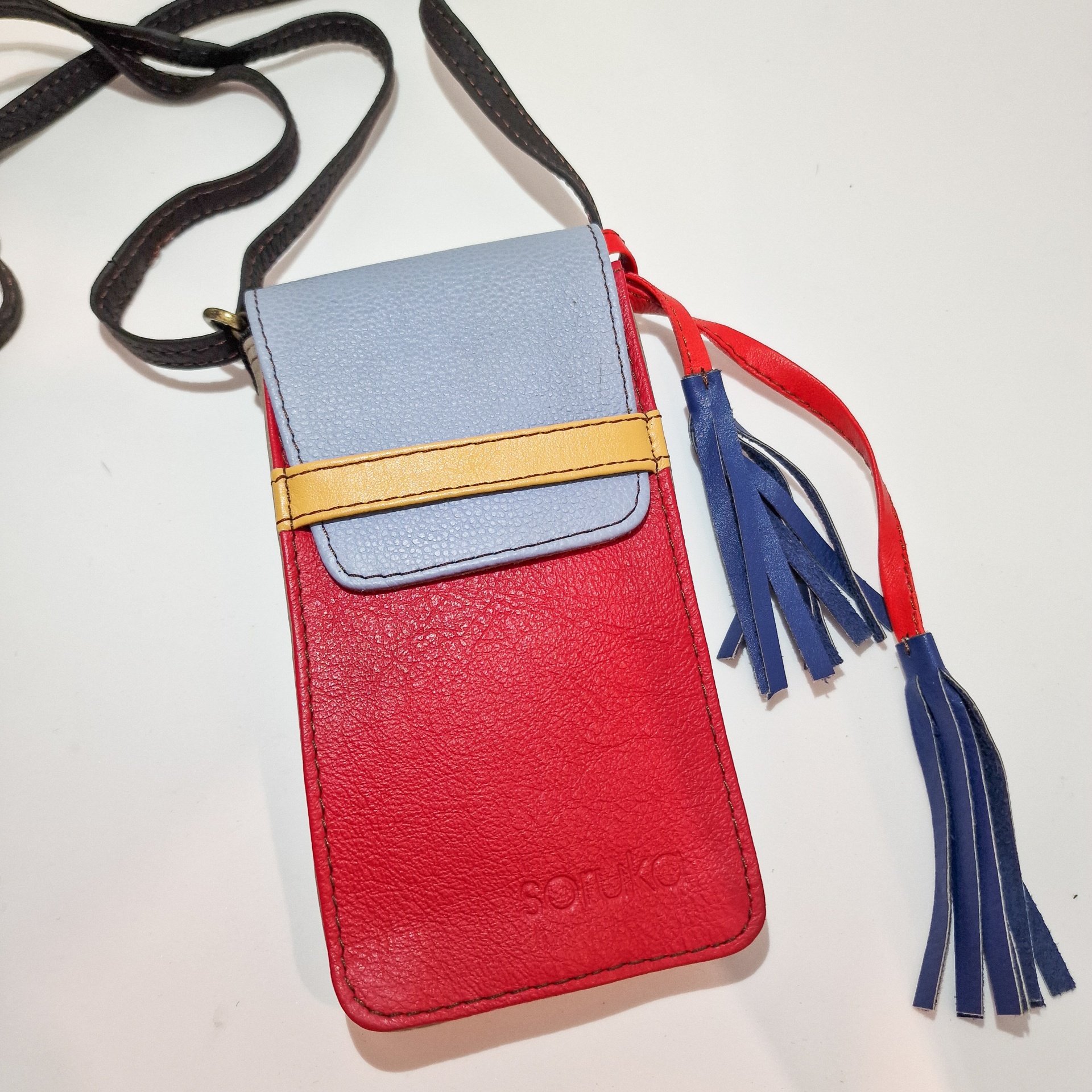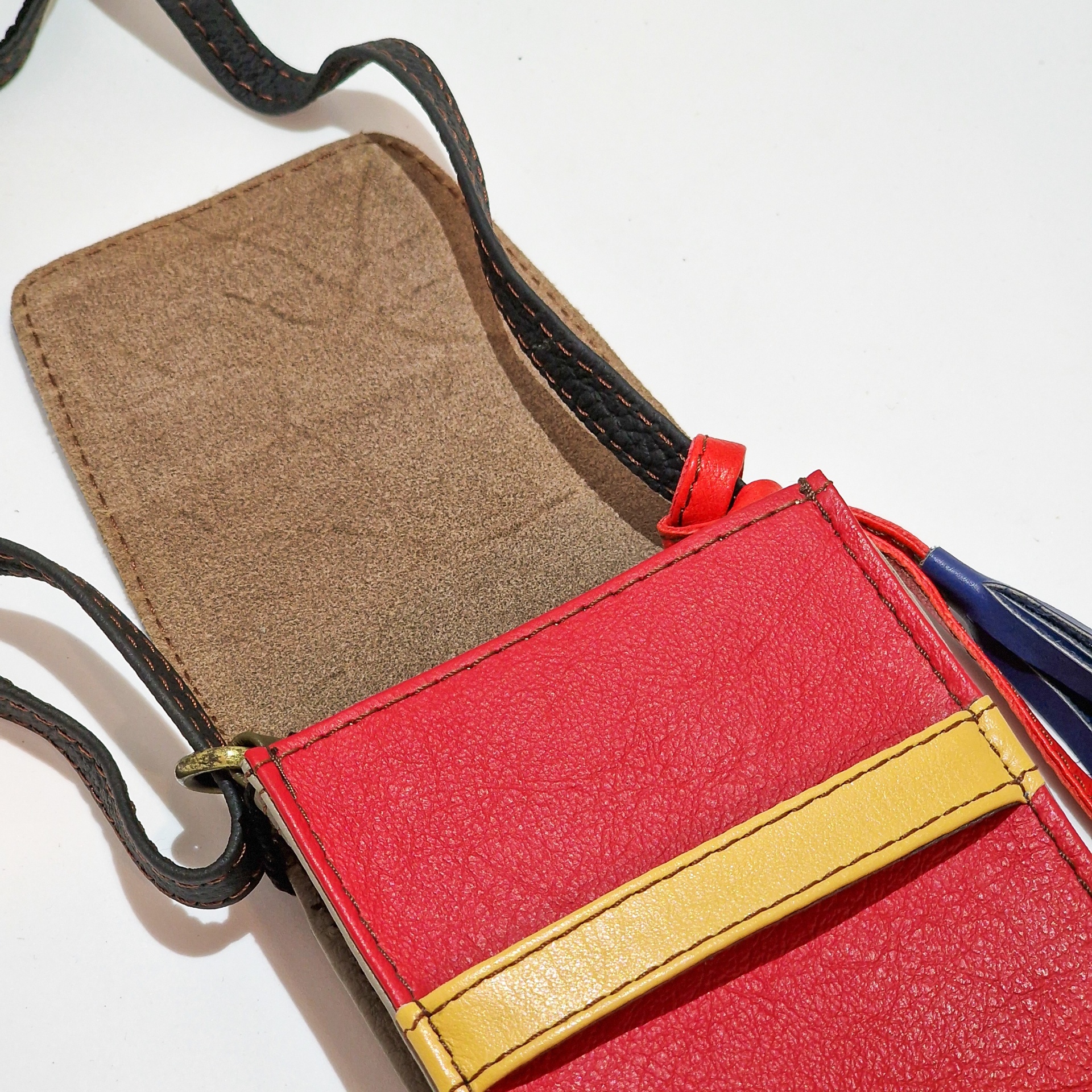 • Bolsa pequena vermelha com aba azul clara e detalhes coloridos para telemóvel