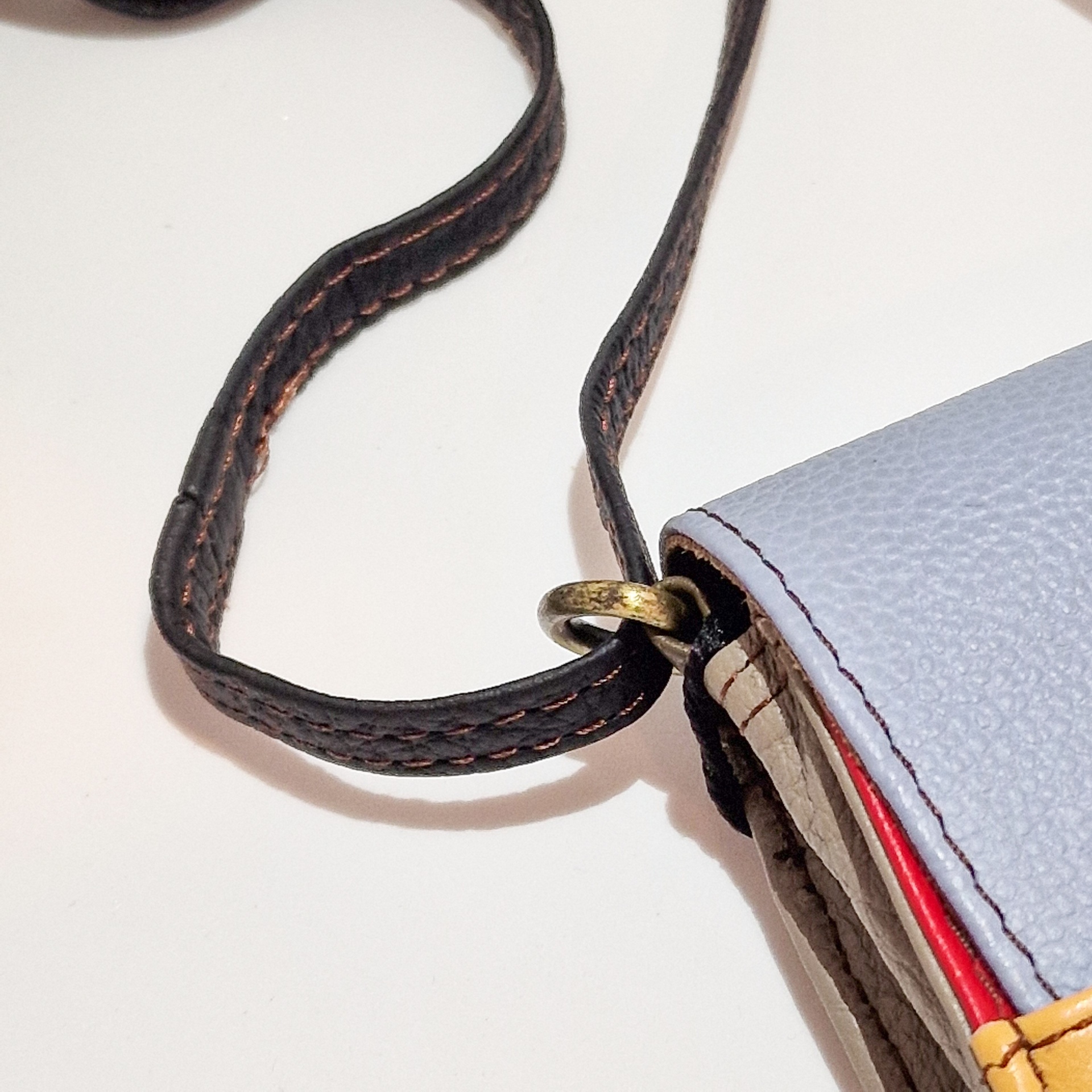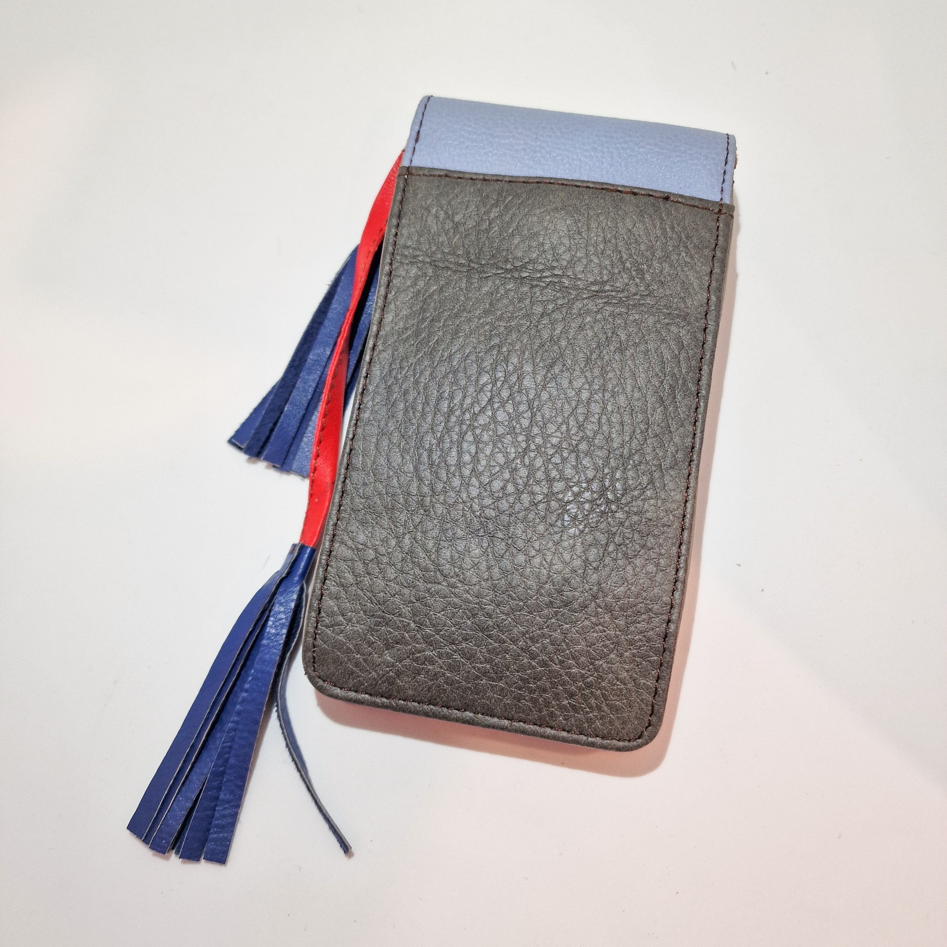 • Carteira de pele cinzenta com topo azul e franjas coloridas