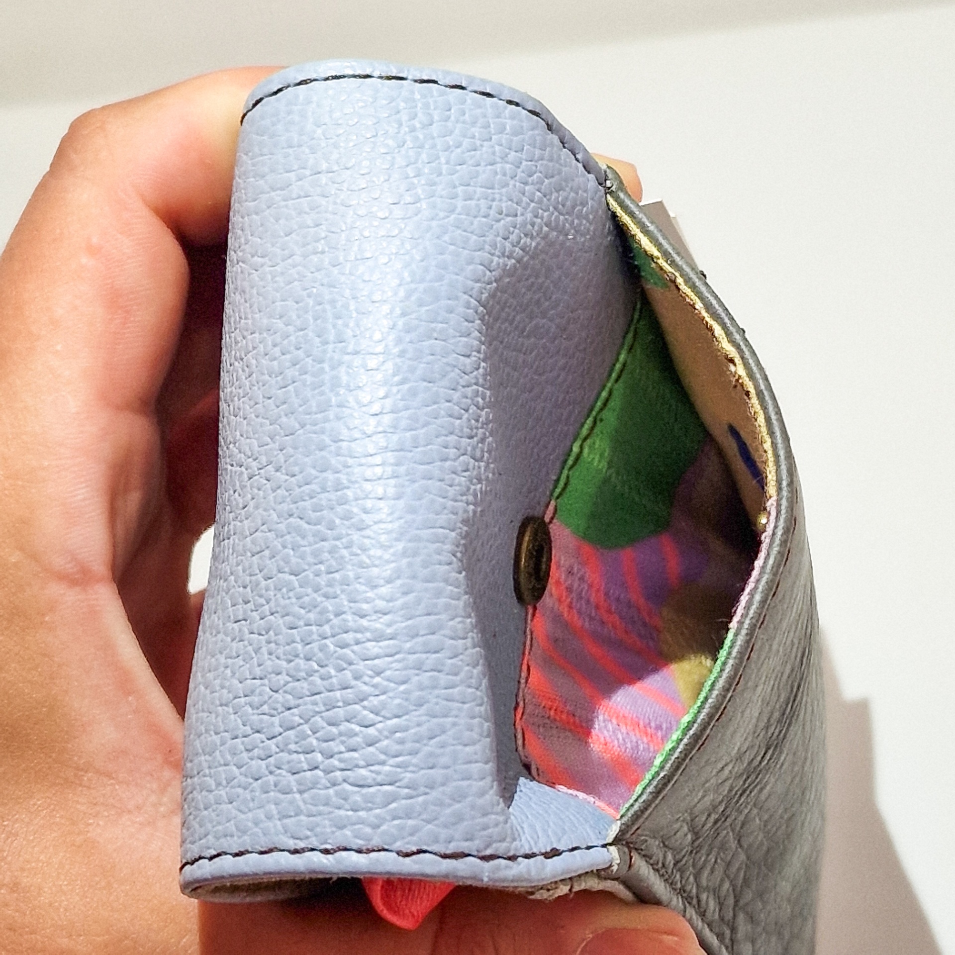 • Carteira pequena de pele cinzenta clara com interior colorido