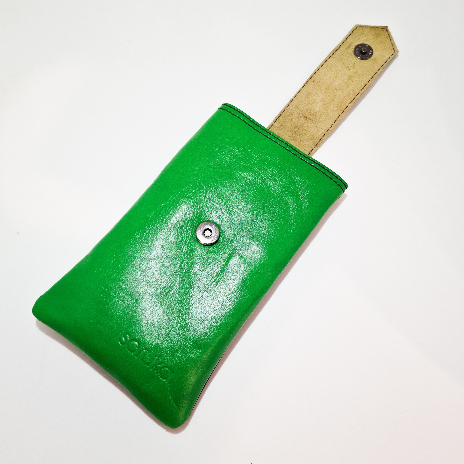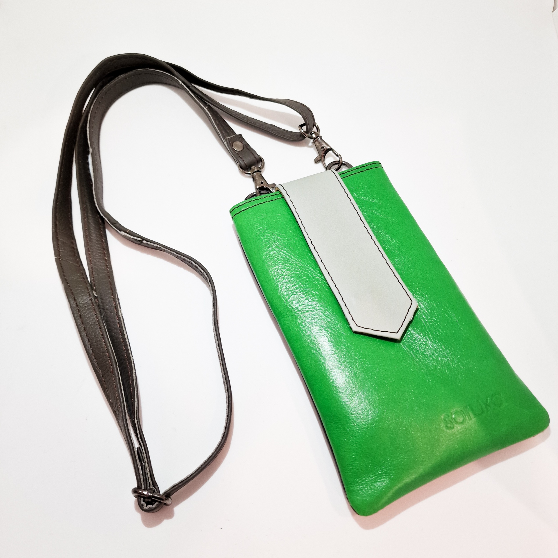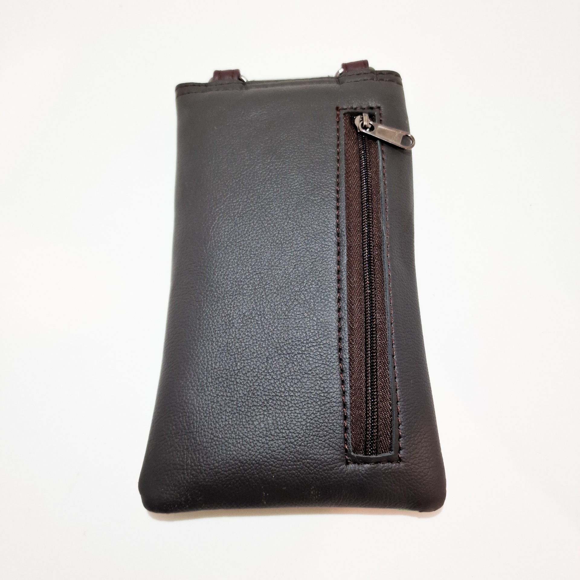 Bolsa para telefone com compartimento com fecho, 100% couro reciclado, inclui uma alça de couro ajustável e extensível.
