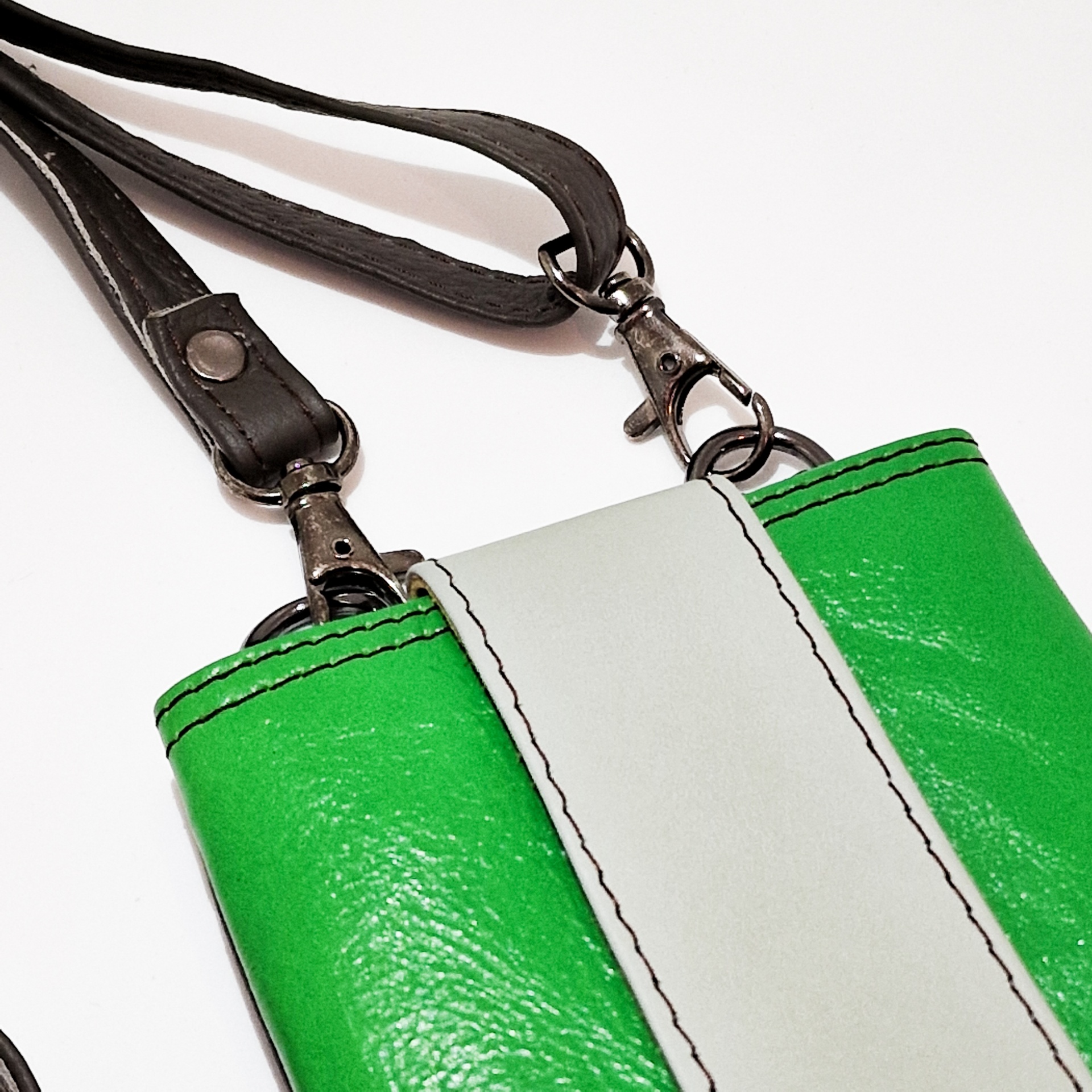 • Carteira verde com faixa branca e alça preta em fundo branco
