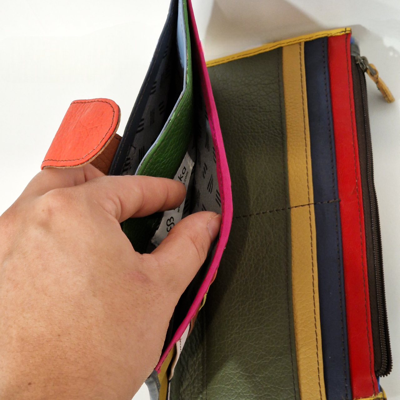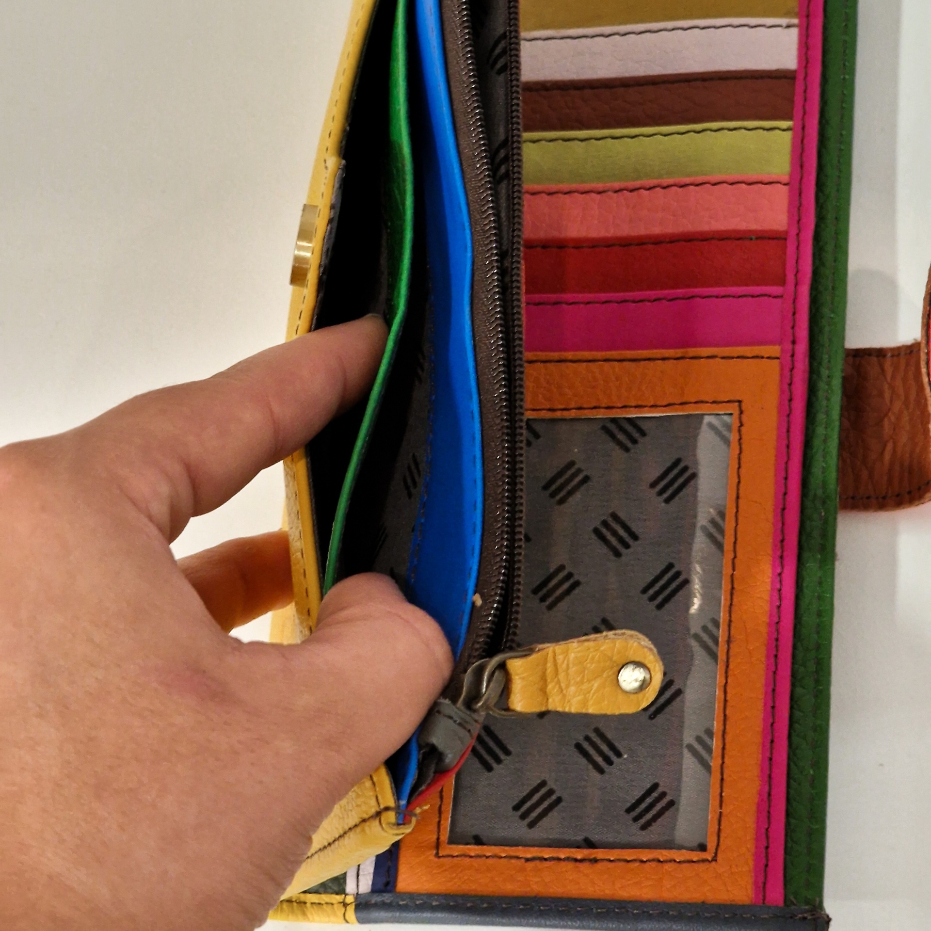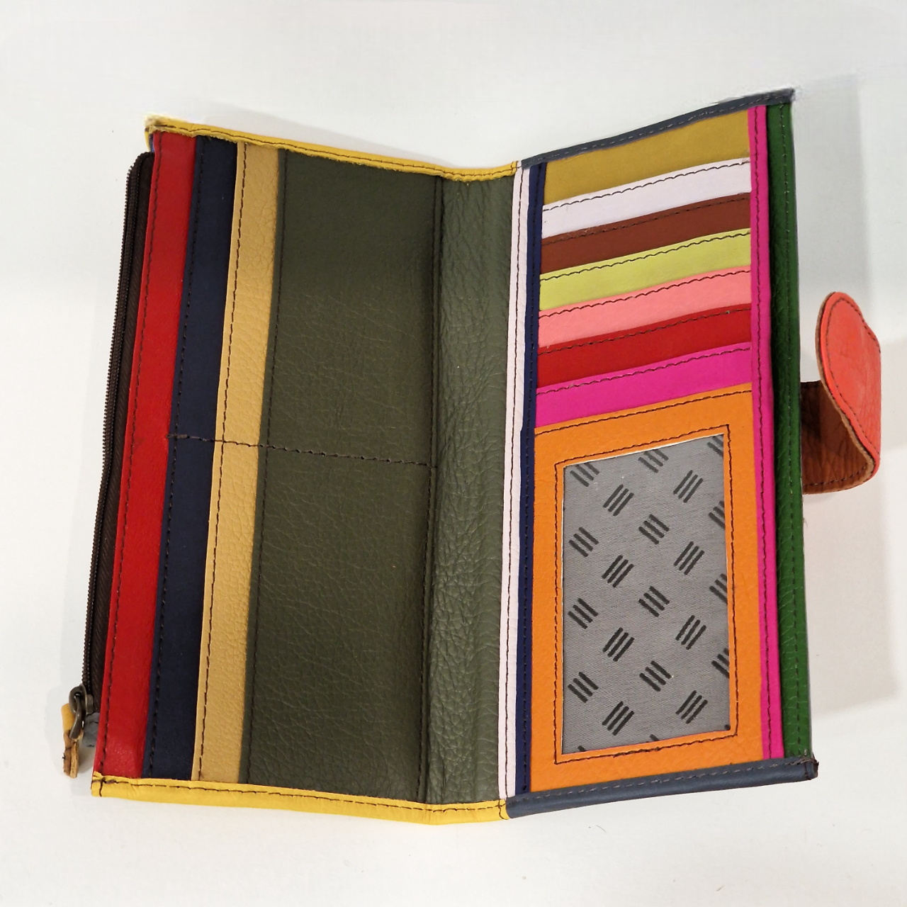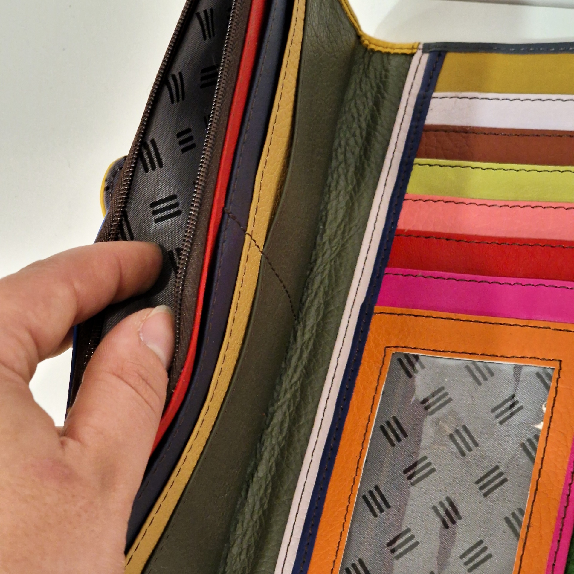• Carteira de pele multicolorida com vários compartimentos para cartões