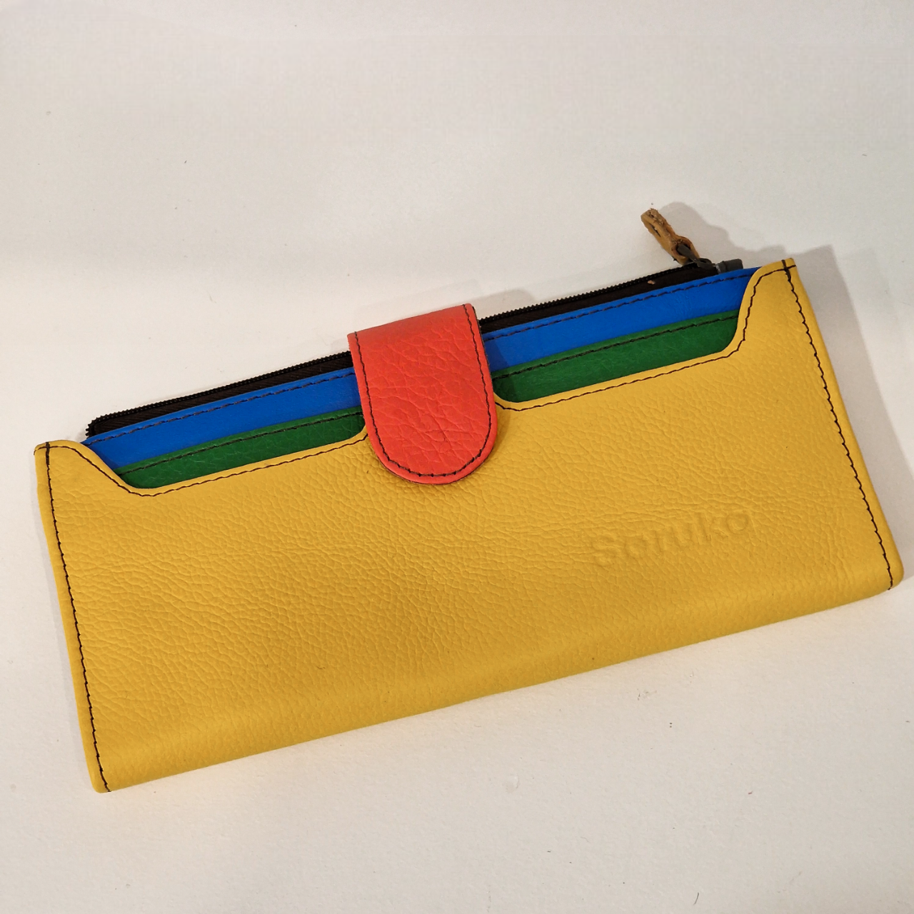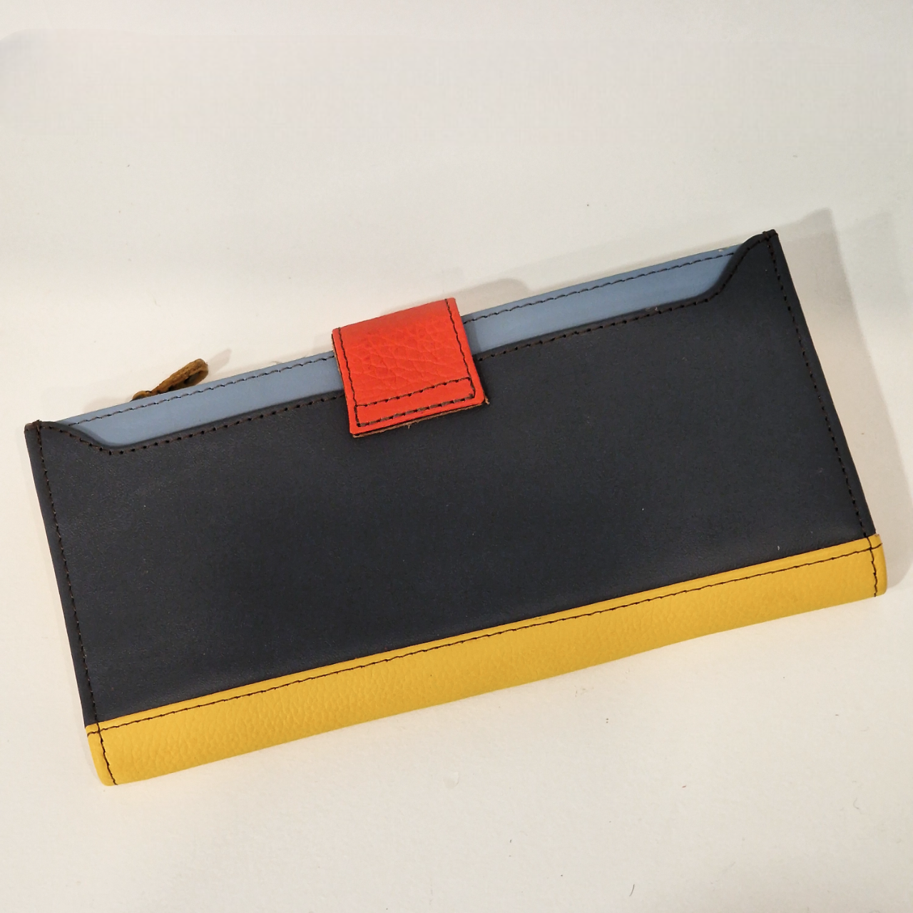 • Carteira retangular de couro colorida em preto, amarelo, azul claro e vermelho