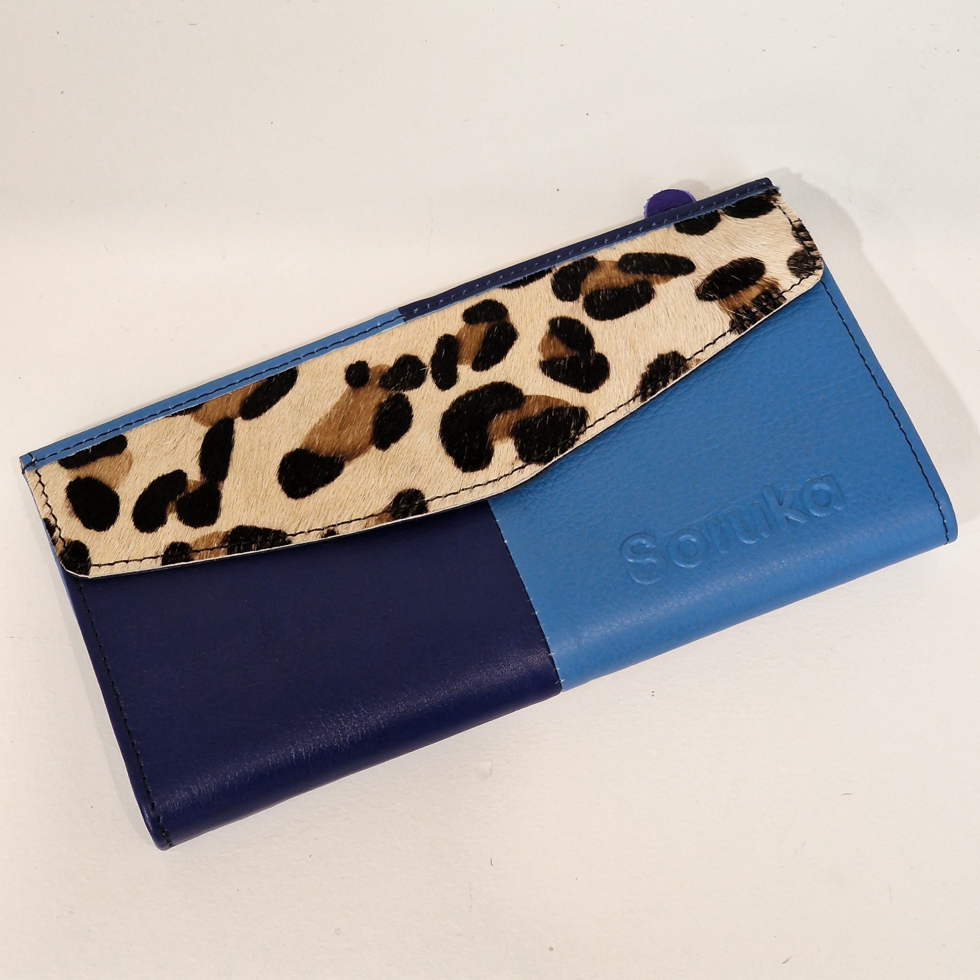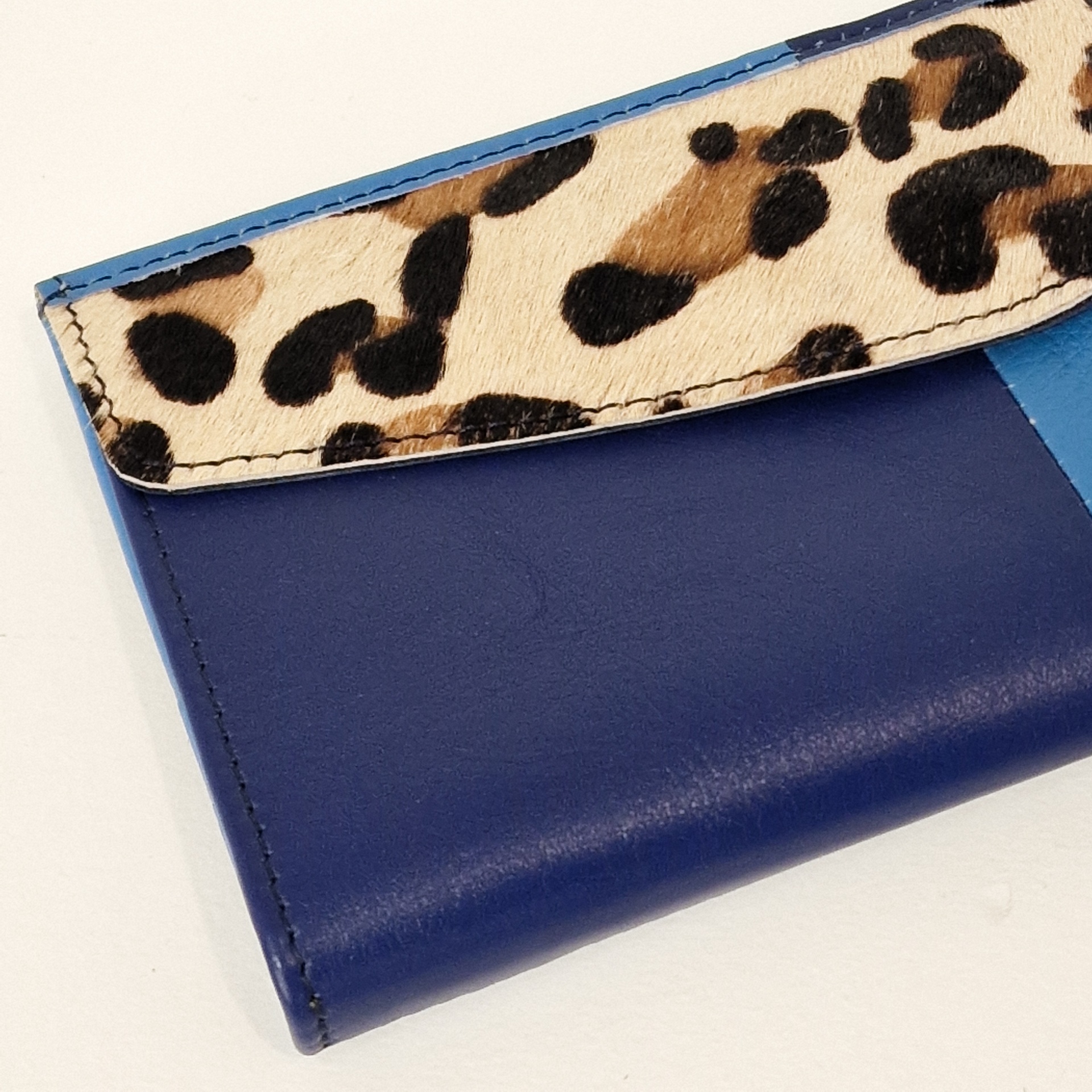 • Carteira azul com interior castanho e aba com padrão animal