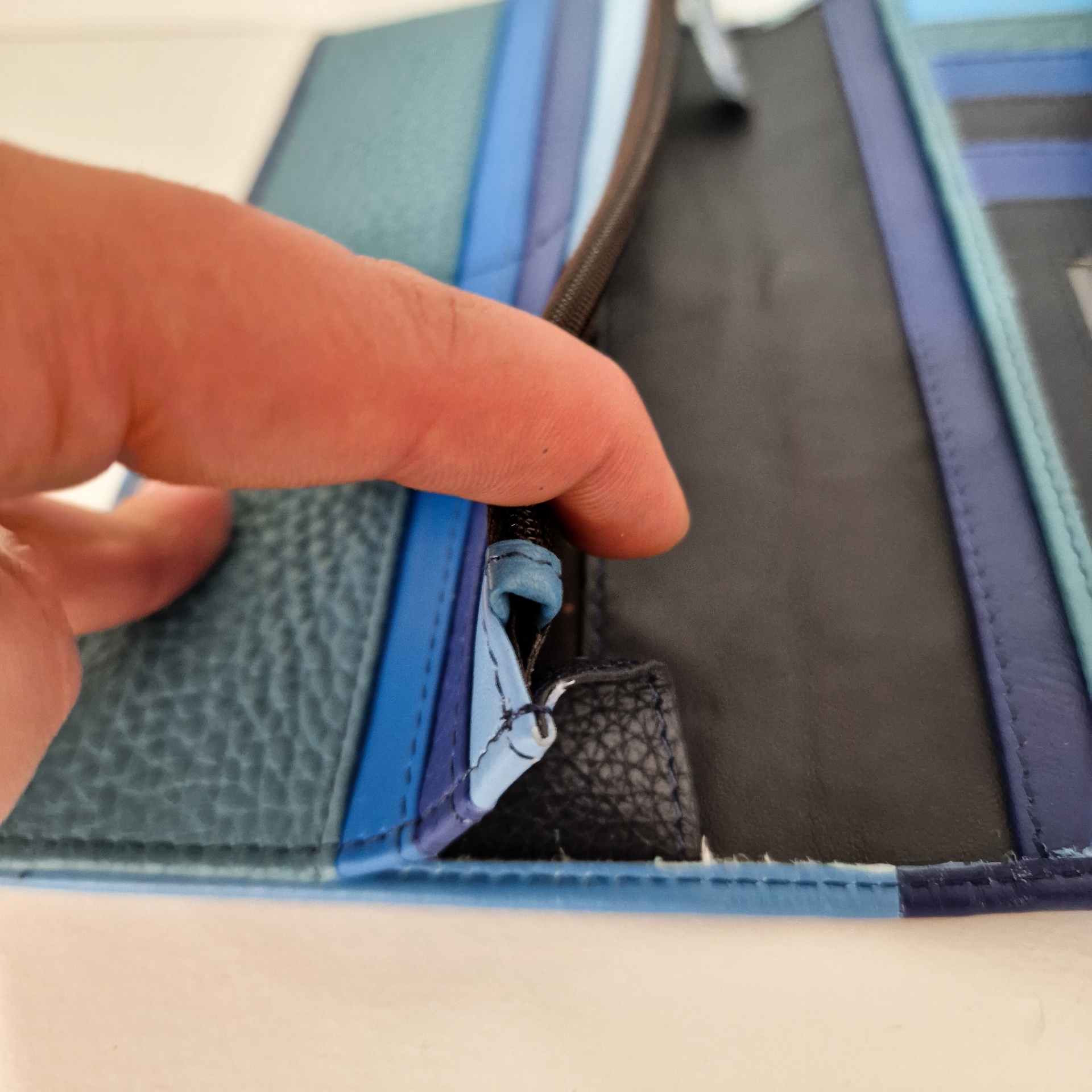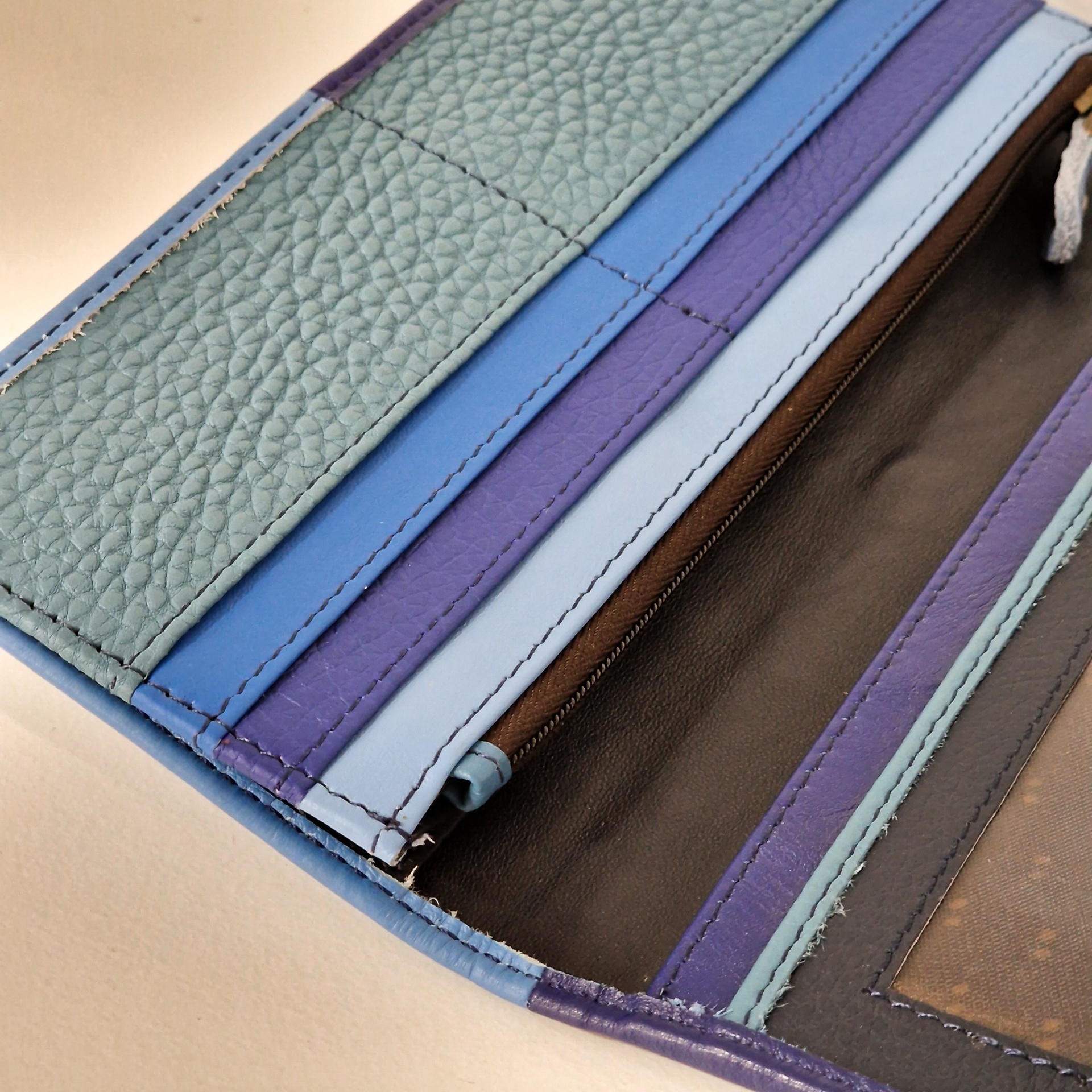 • Carteira de couro colorida com faixas em tons de azul, roxo e castanho