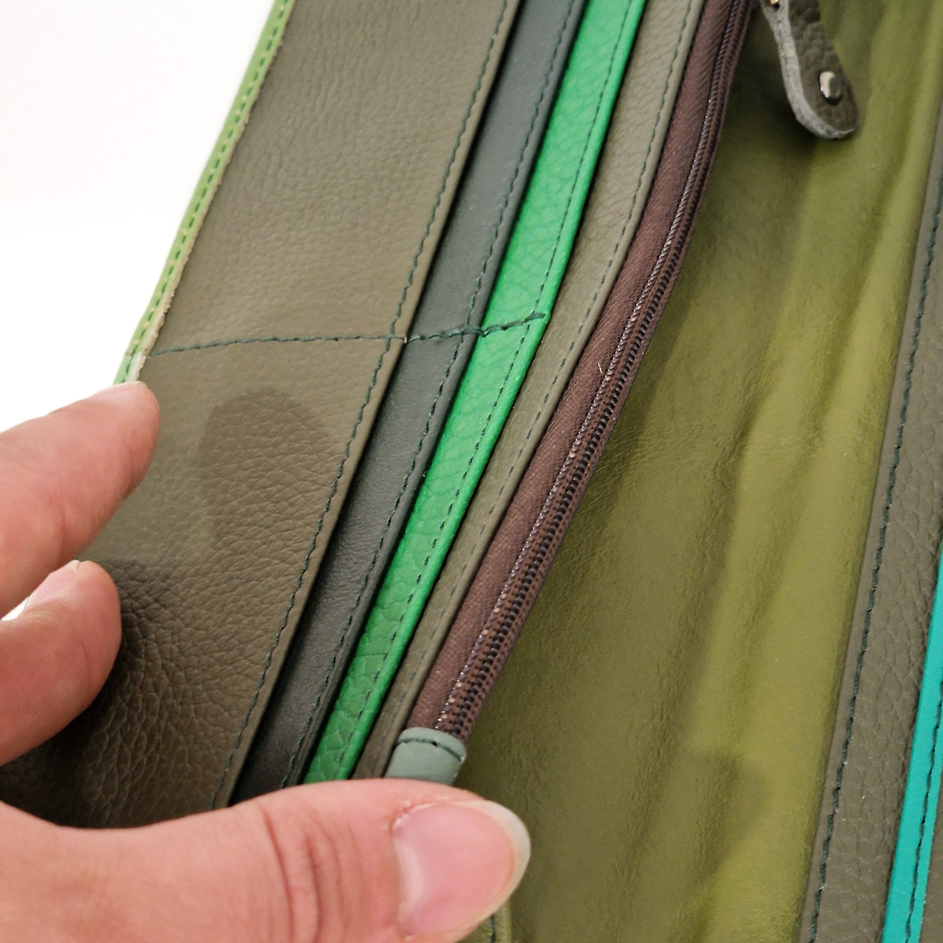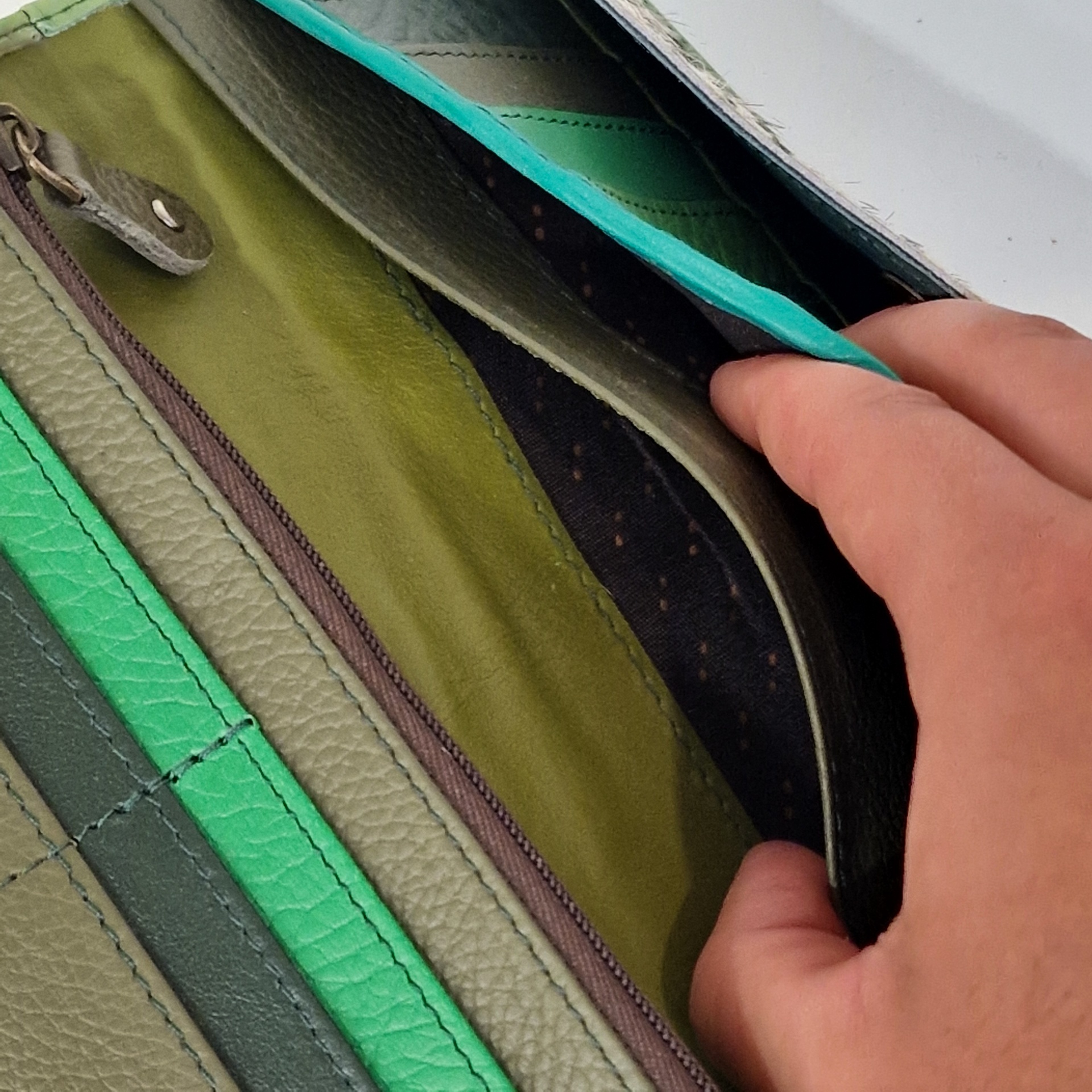 • Bolsa de couro verde com fecho de zíper aberta por uma mão