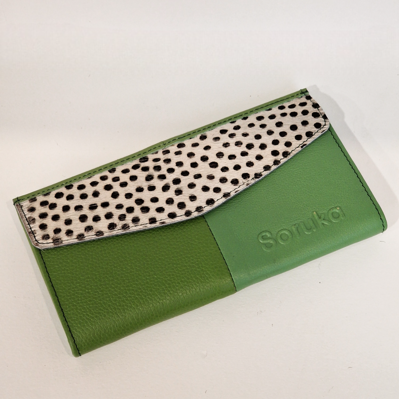 • Carteira verde em couro com aba branca e preta e gravura da marca Sonuka