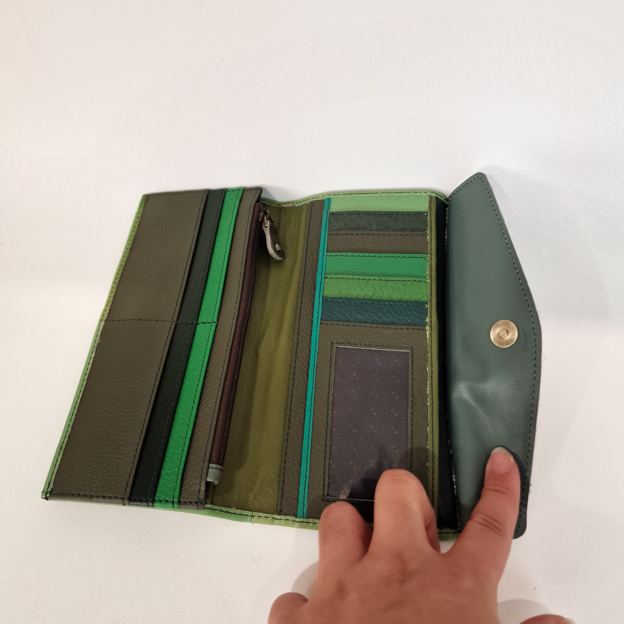 • Carteira de pele verde aberta com vários compartimentos para cartões e fecho de mola metálico