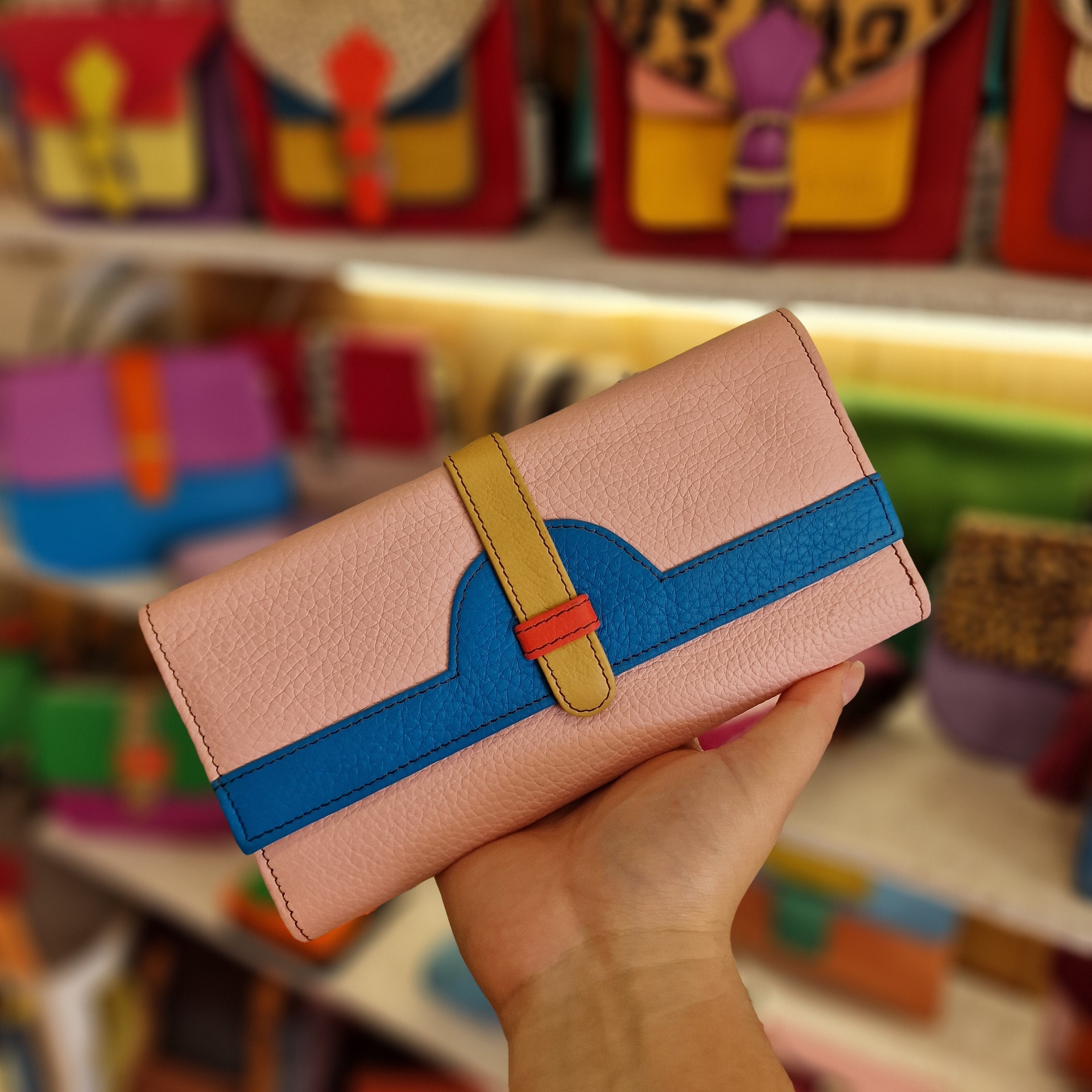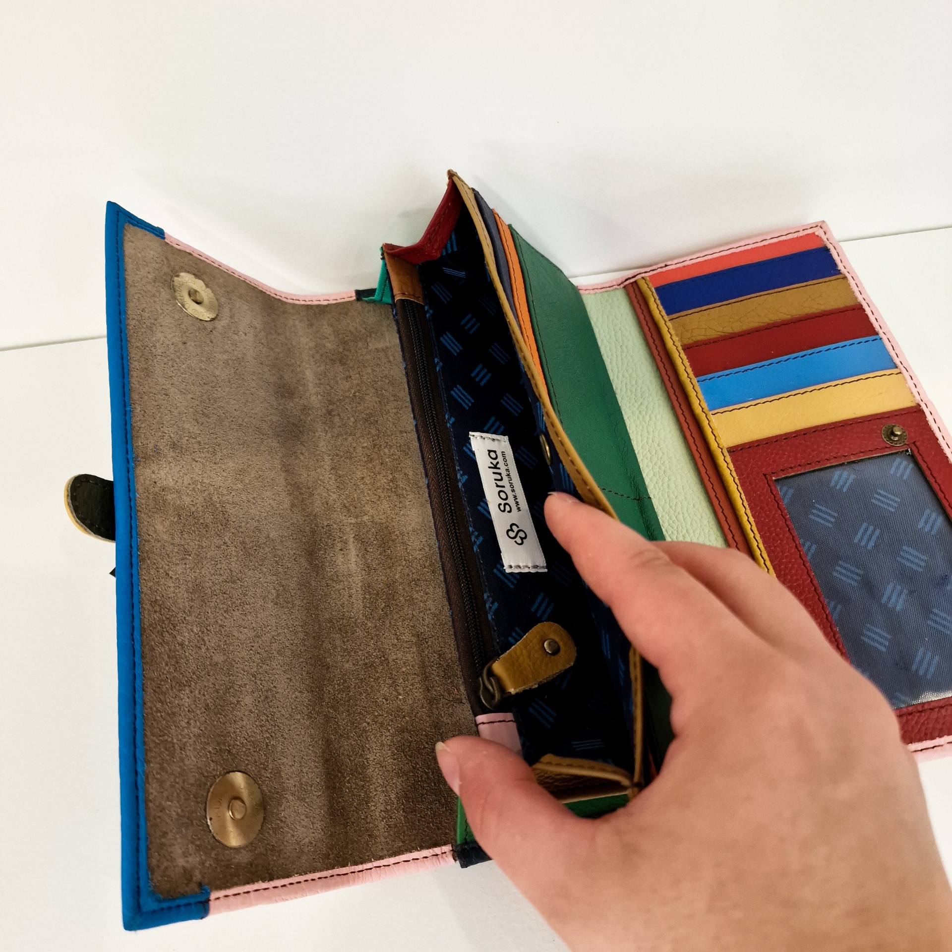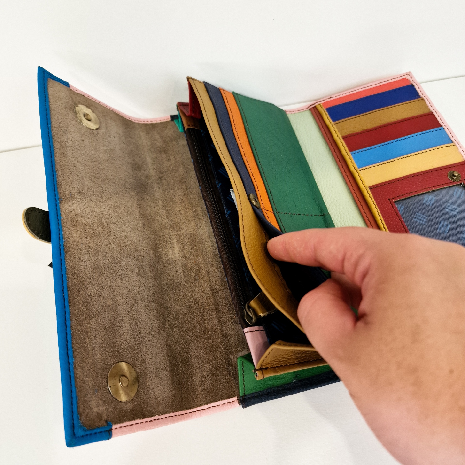 • Carteira colorida de couro com vários compartimentos e uma mão a abrir um deles