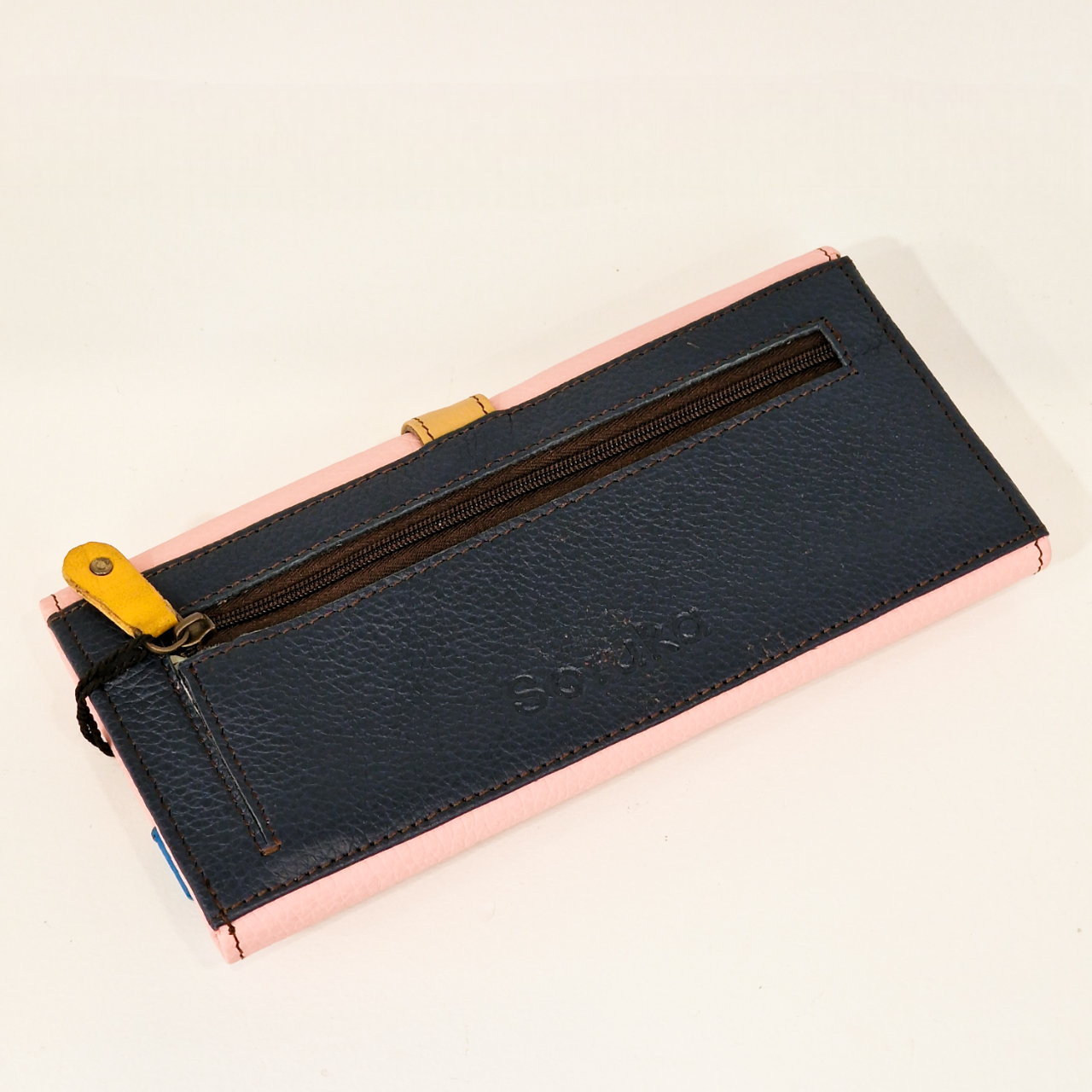 • Carteira de couro rosa com detalhe azul e fecho amarelo sobre fundo branco