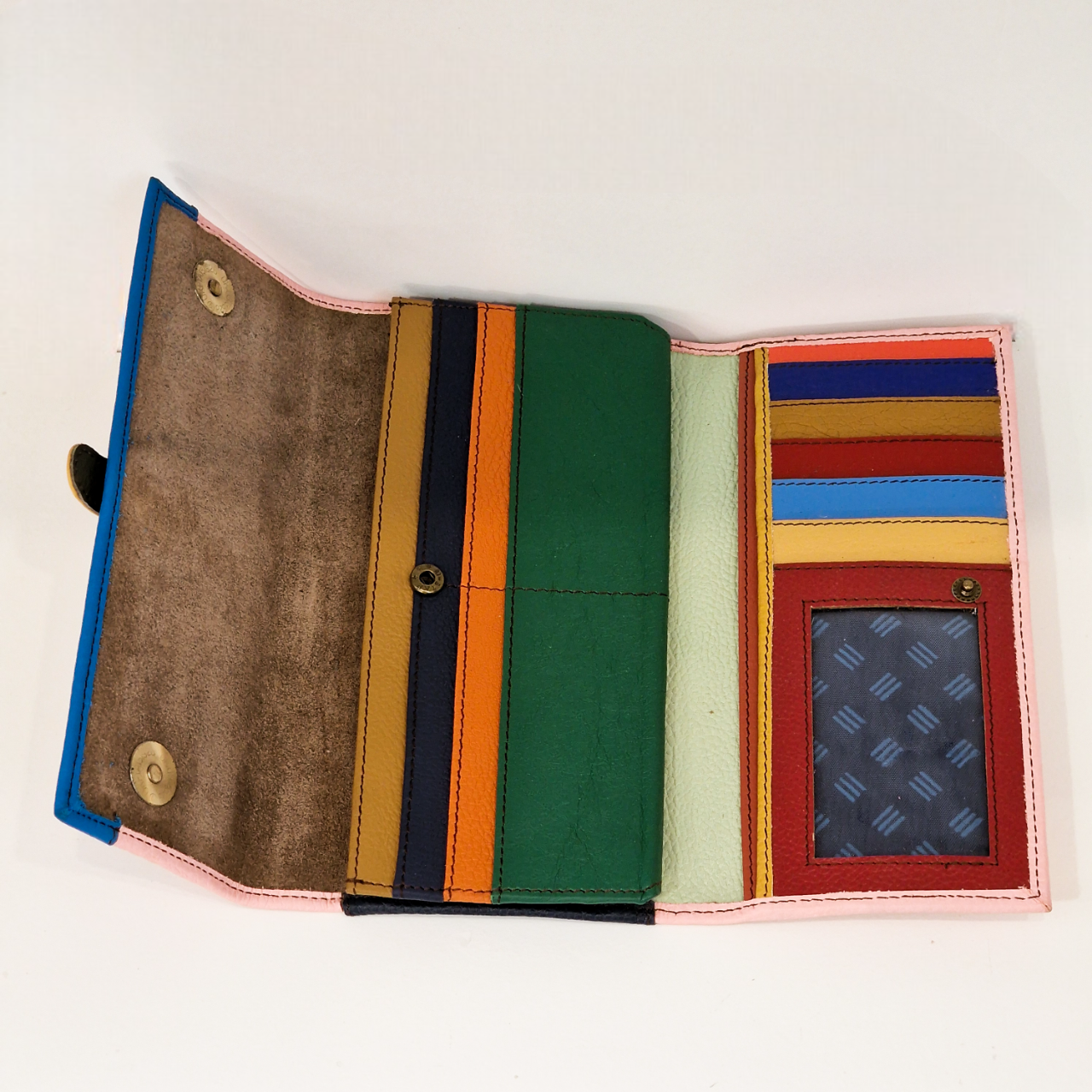 • Carteira de couro multicolor com faixas horizontais e compartimentos para cartões