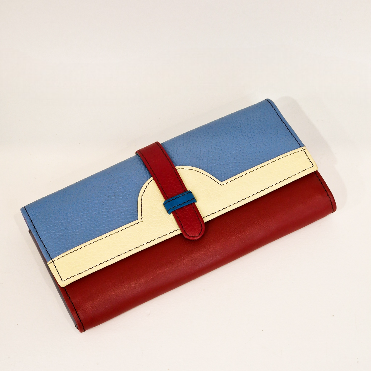 • Carteira em pele azul, creme e vermelha com fecho em aba