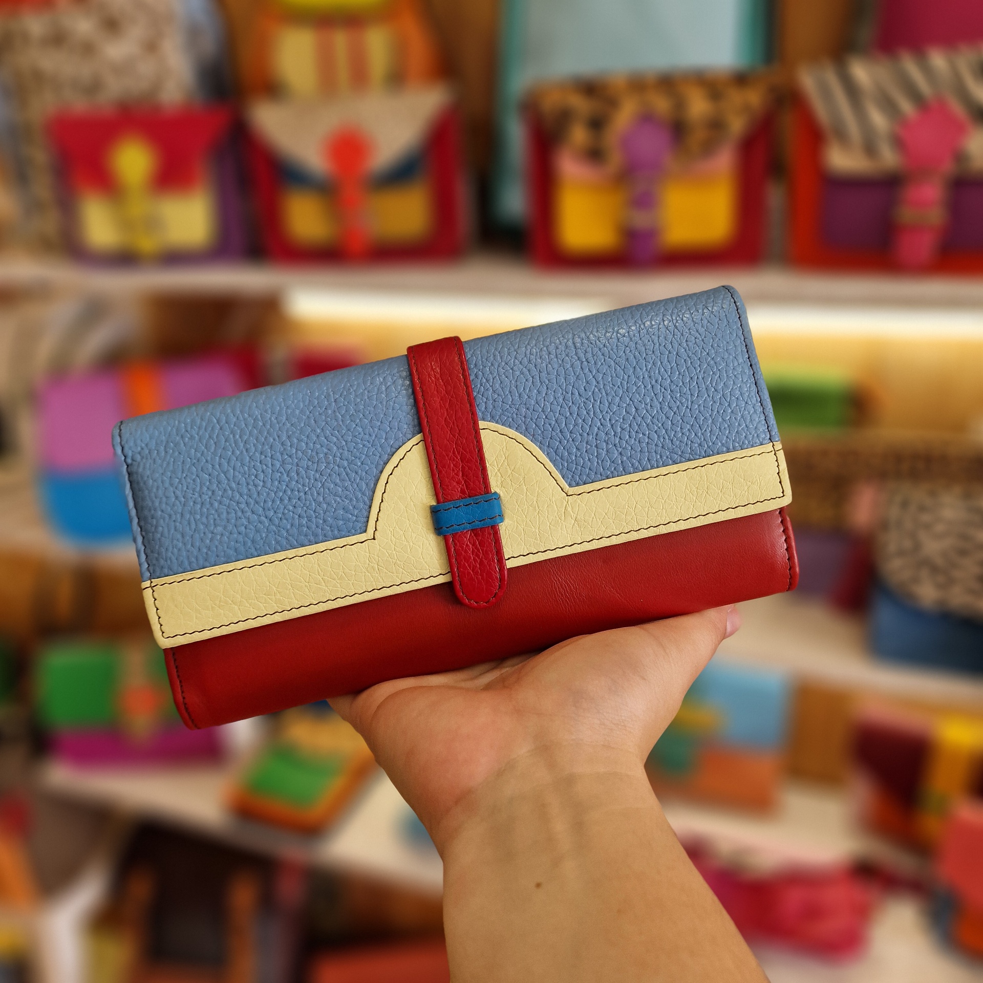 • Carteira tricolor em couro segurada por uma mão com várias carteiras coloridas ao fundo
