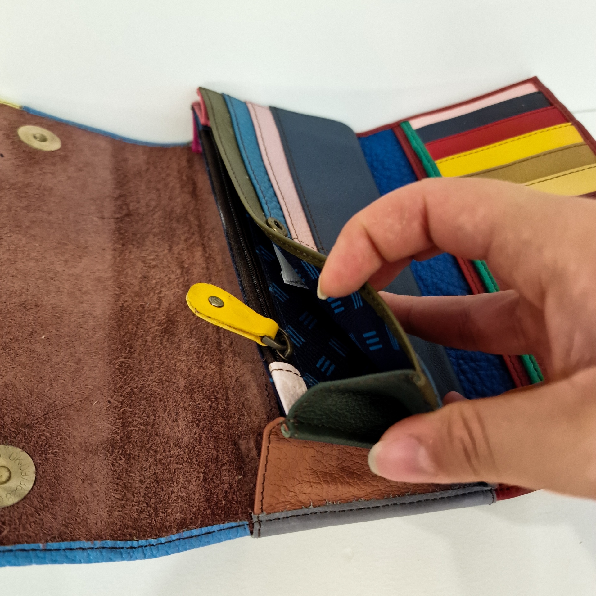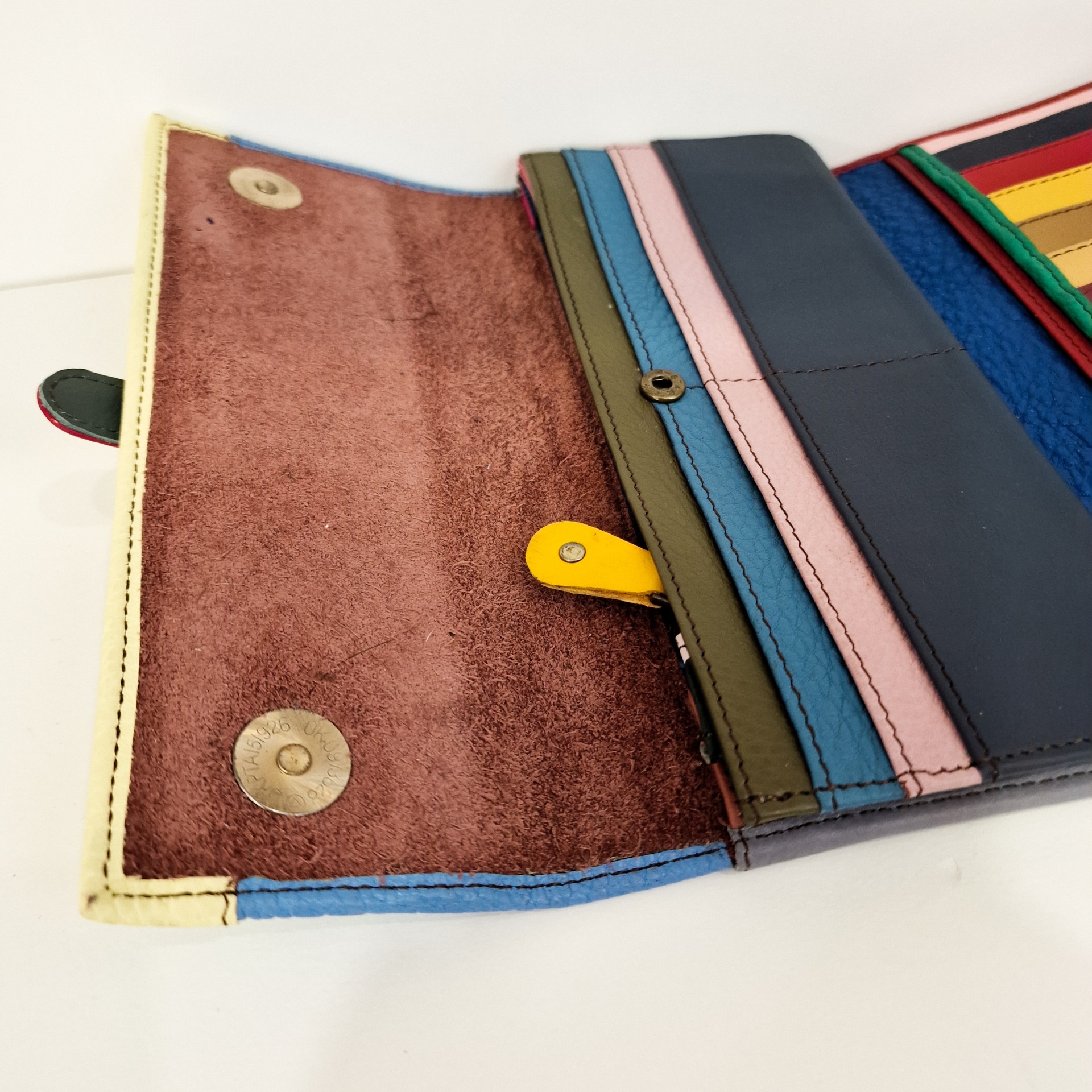 • Carteira de couro multicolorida aberta com várias divisórias para cartões e fecho metálico