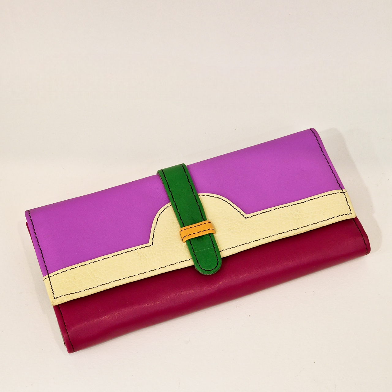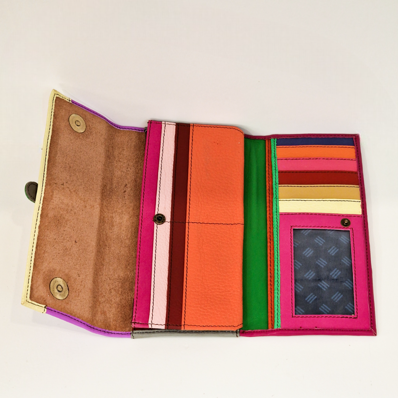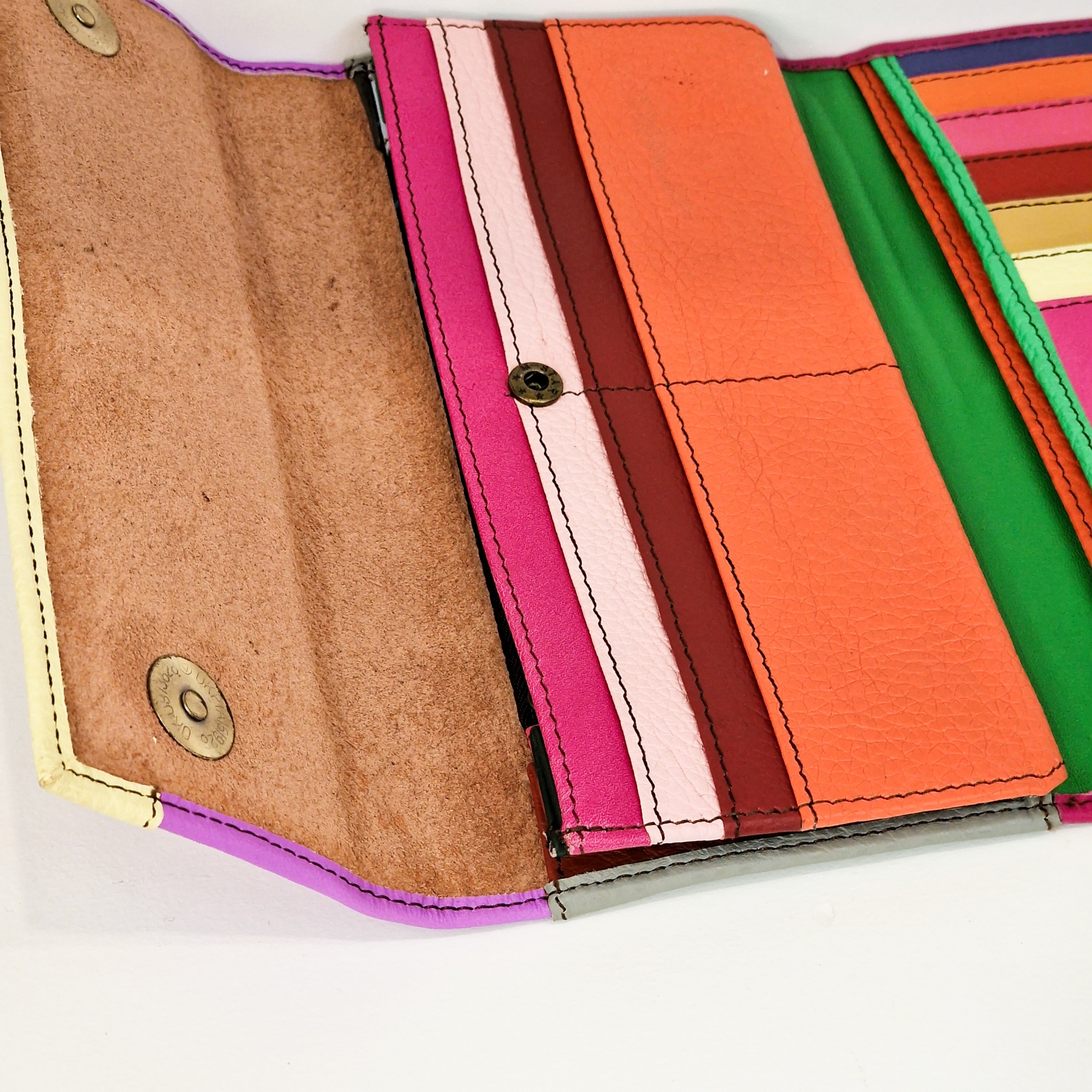 • Carteira de couro colorida com vários compartimentos e interior camurça