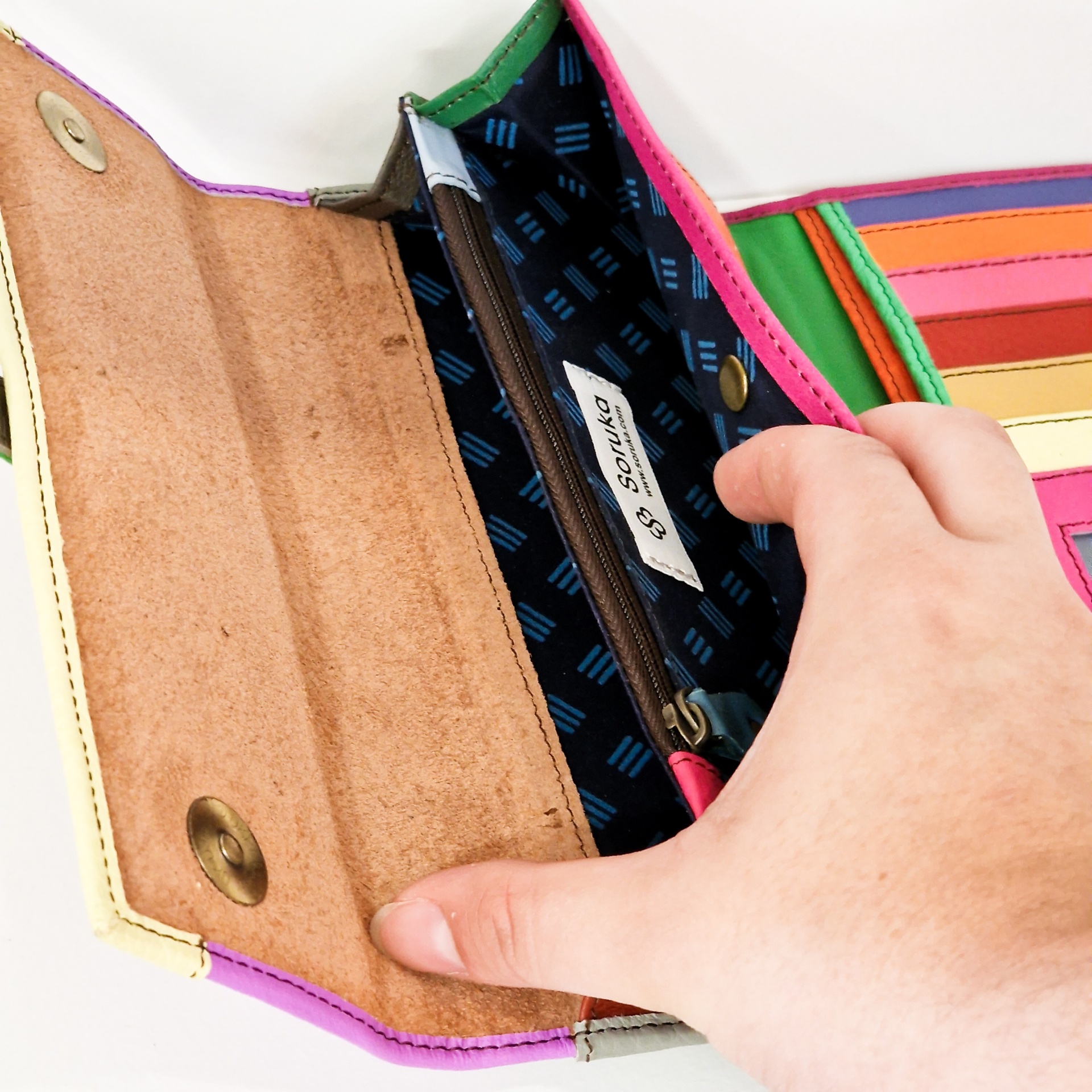 • Carteira colorida de pele aberta com fecho magnético e etiqueta Soruka no interior