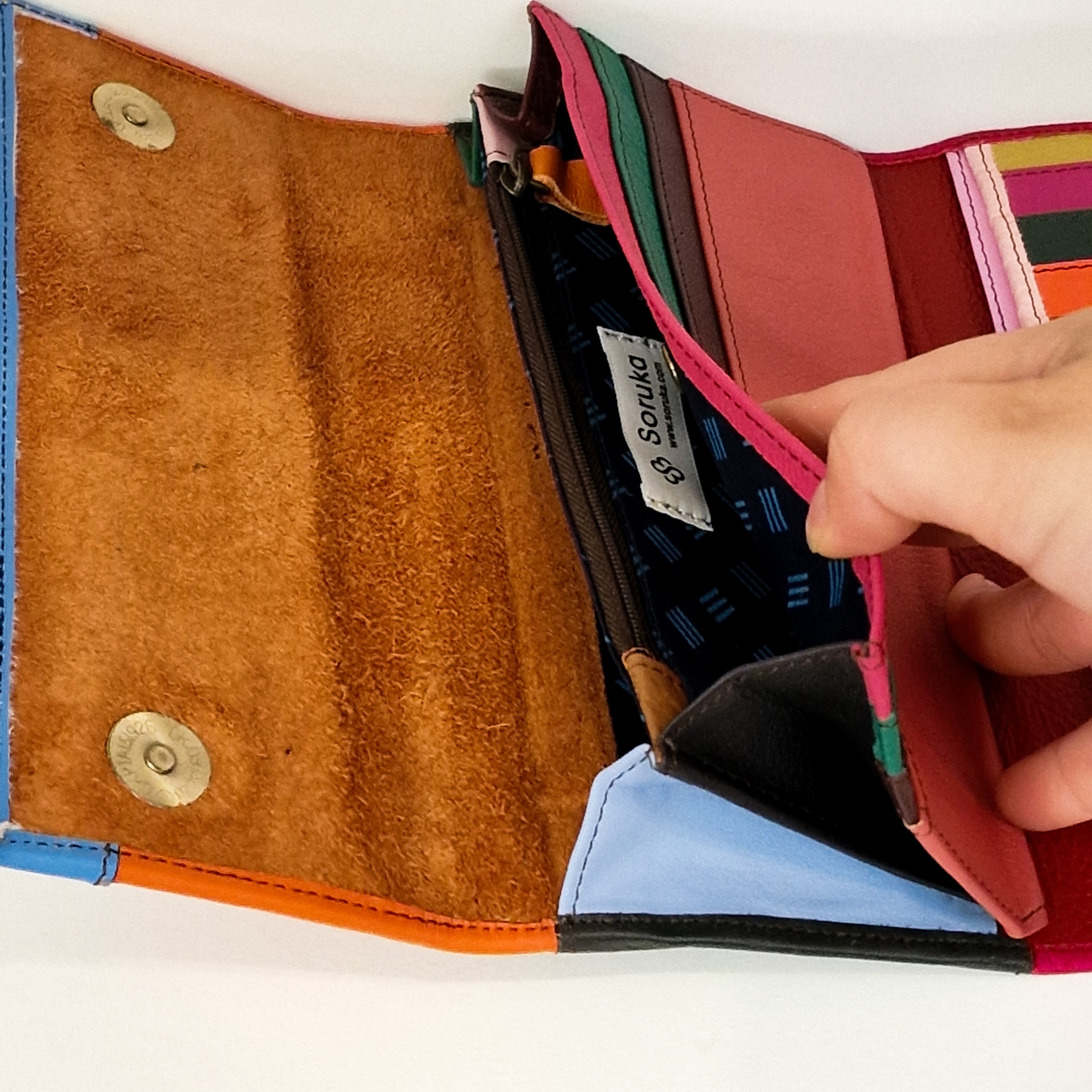 • Carteira colorida em pele aberta a mostrar interior e etiqueta Soruka