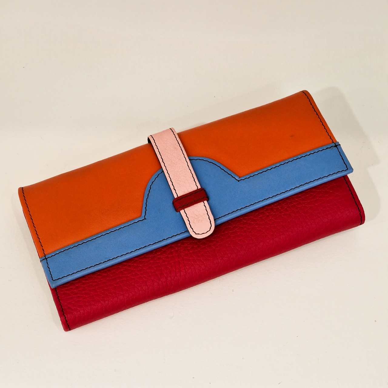 • Carteira de couro tricolor com fecho rosa