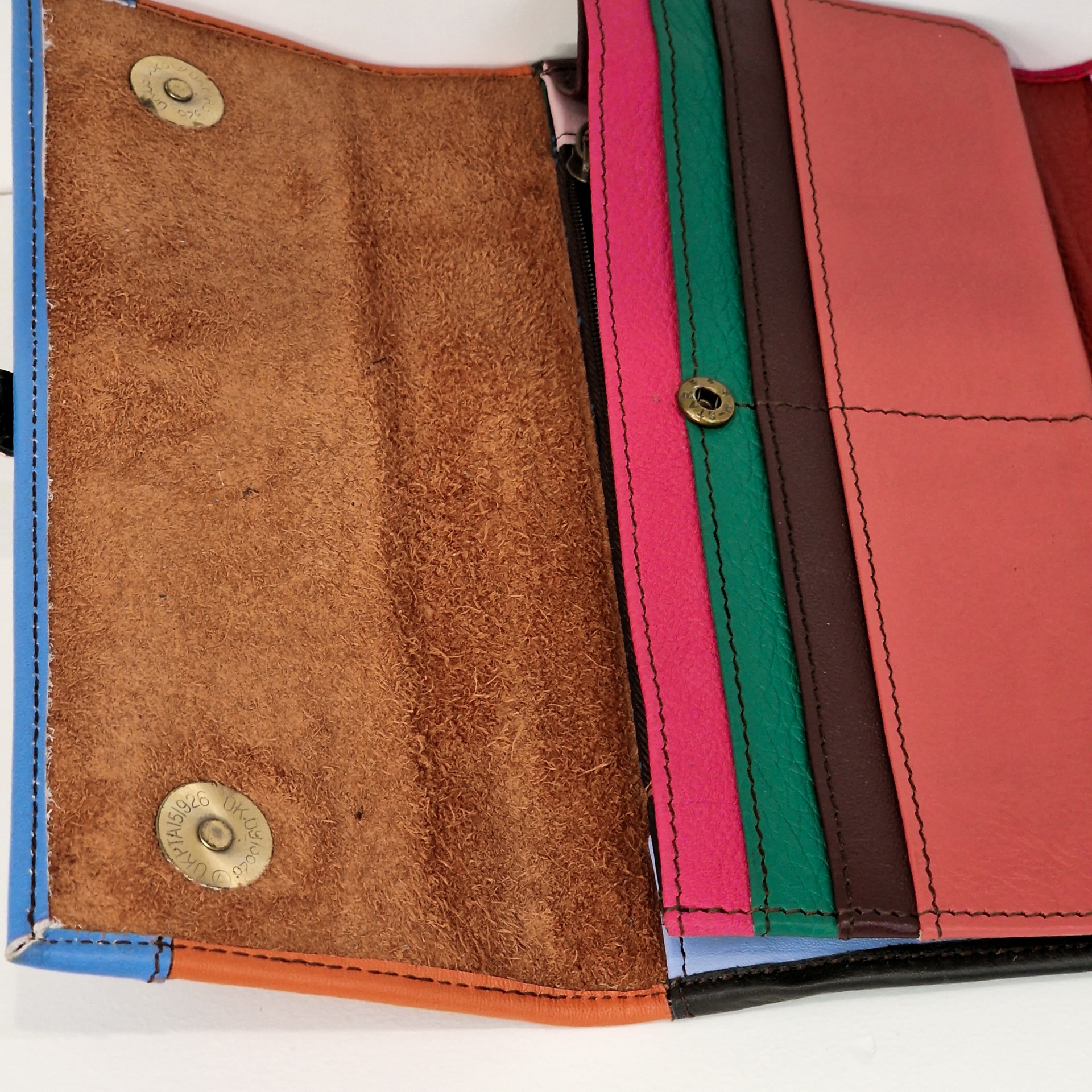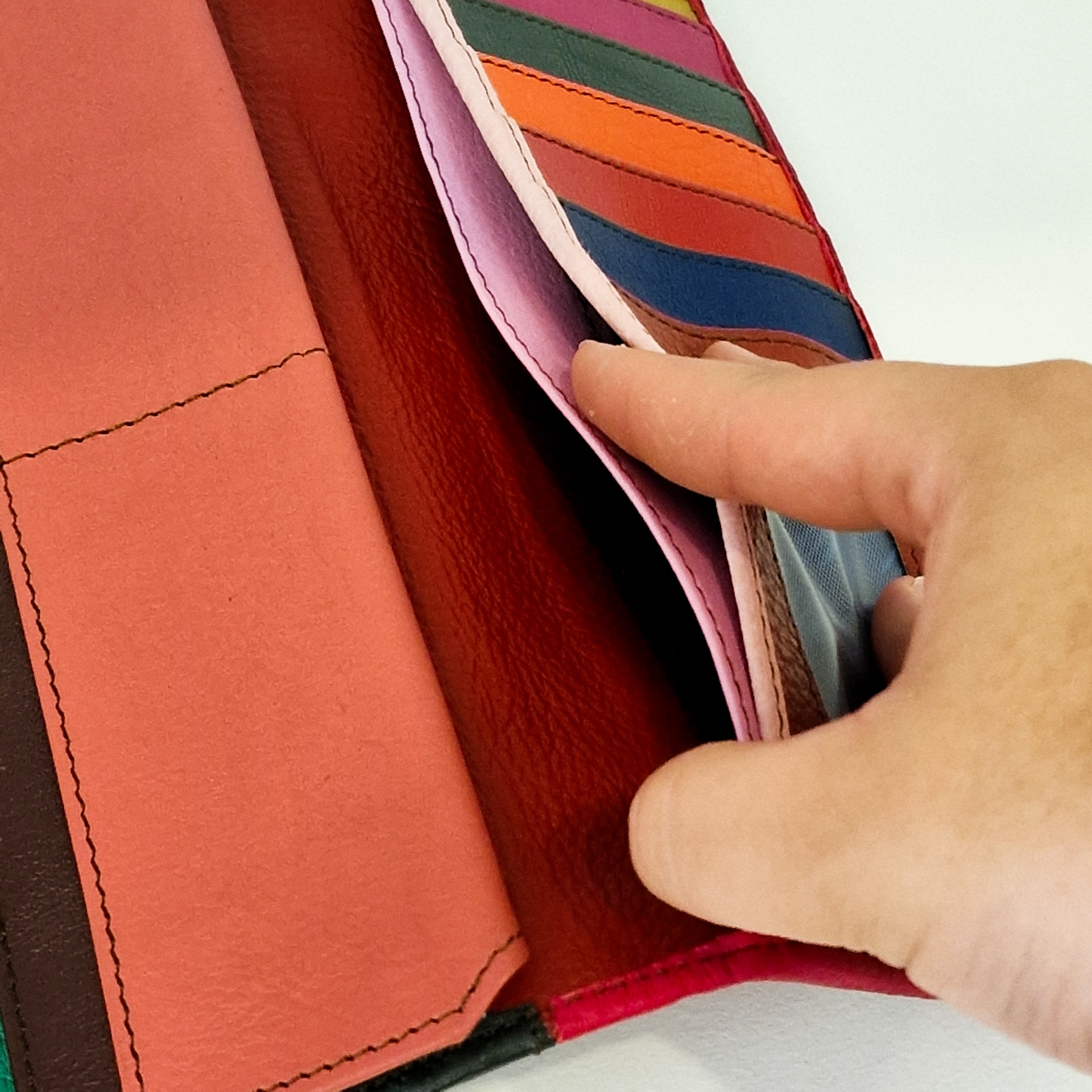 • Carteira de couro com bolsos coloridos e mão abrindo compartimento.