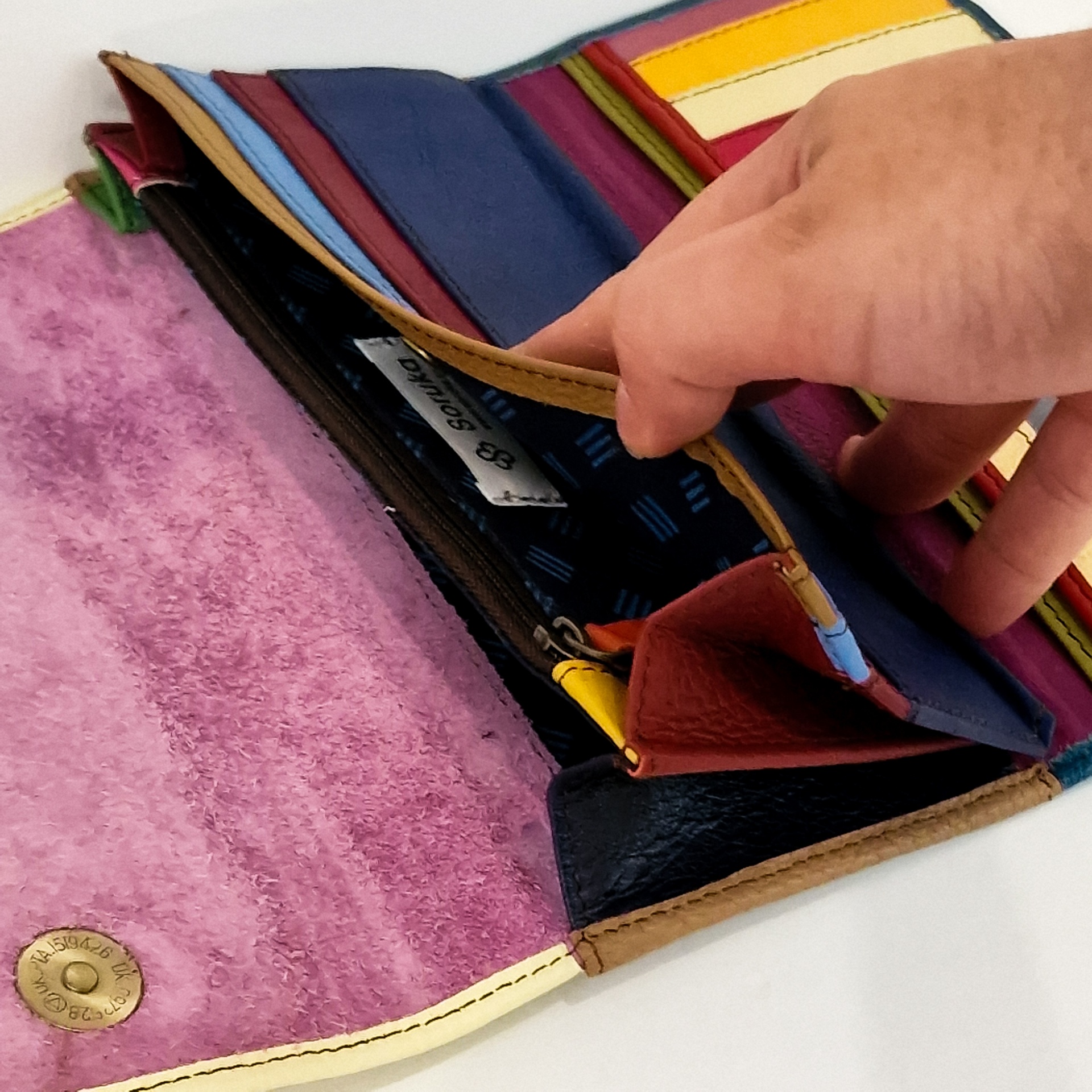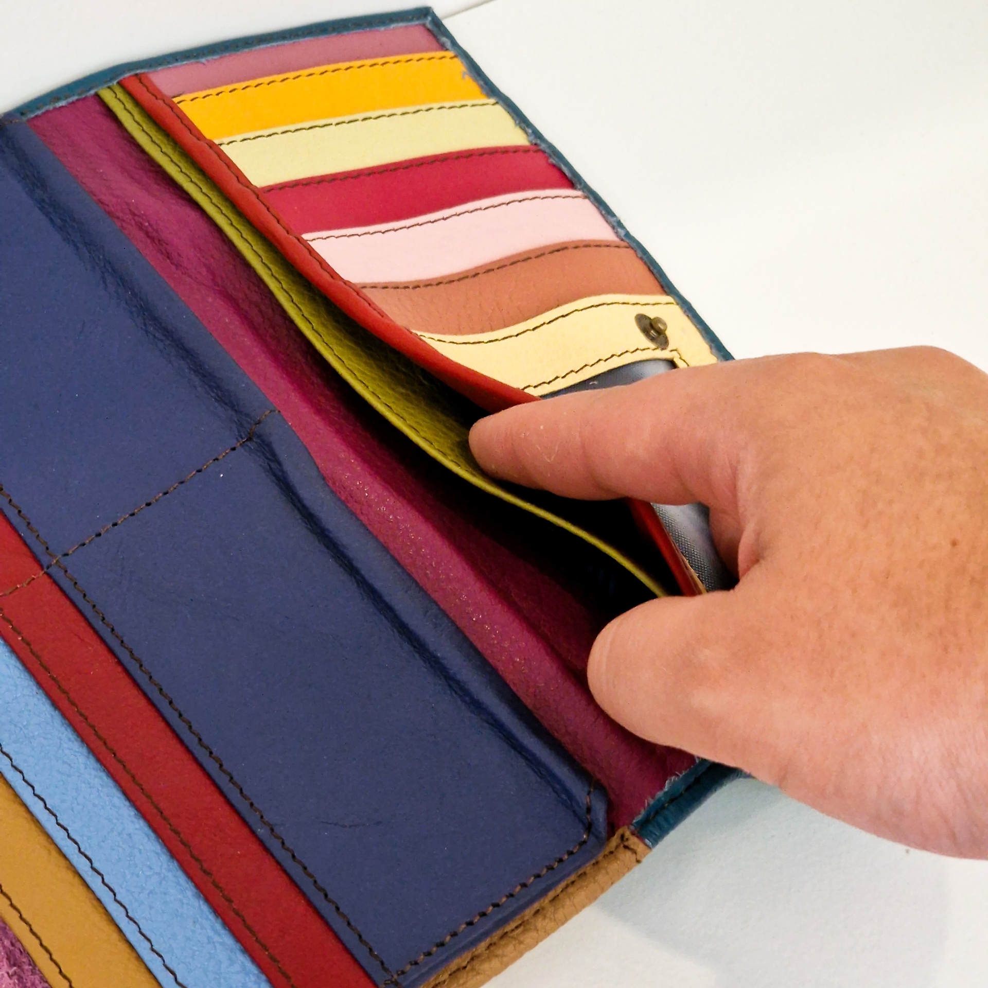 • Carteira de couro multicolor aberta com divisórias para cartões e uma mão em contacto