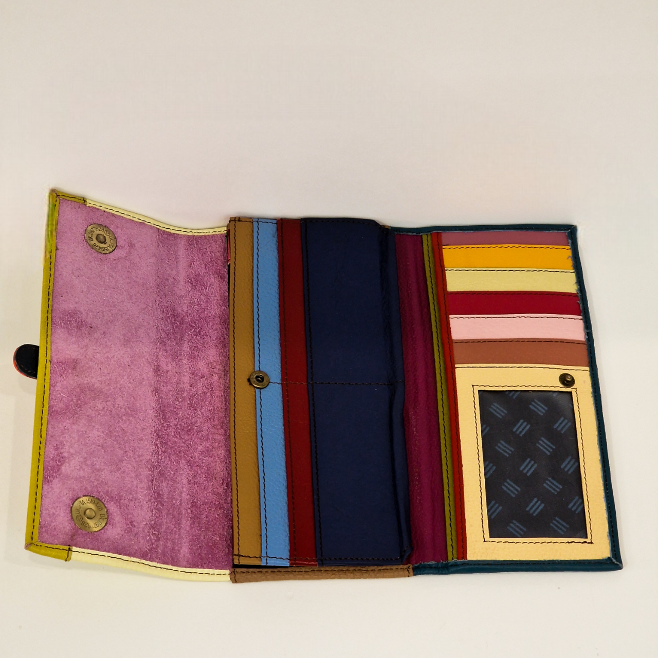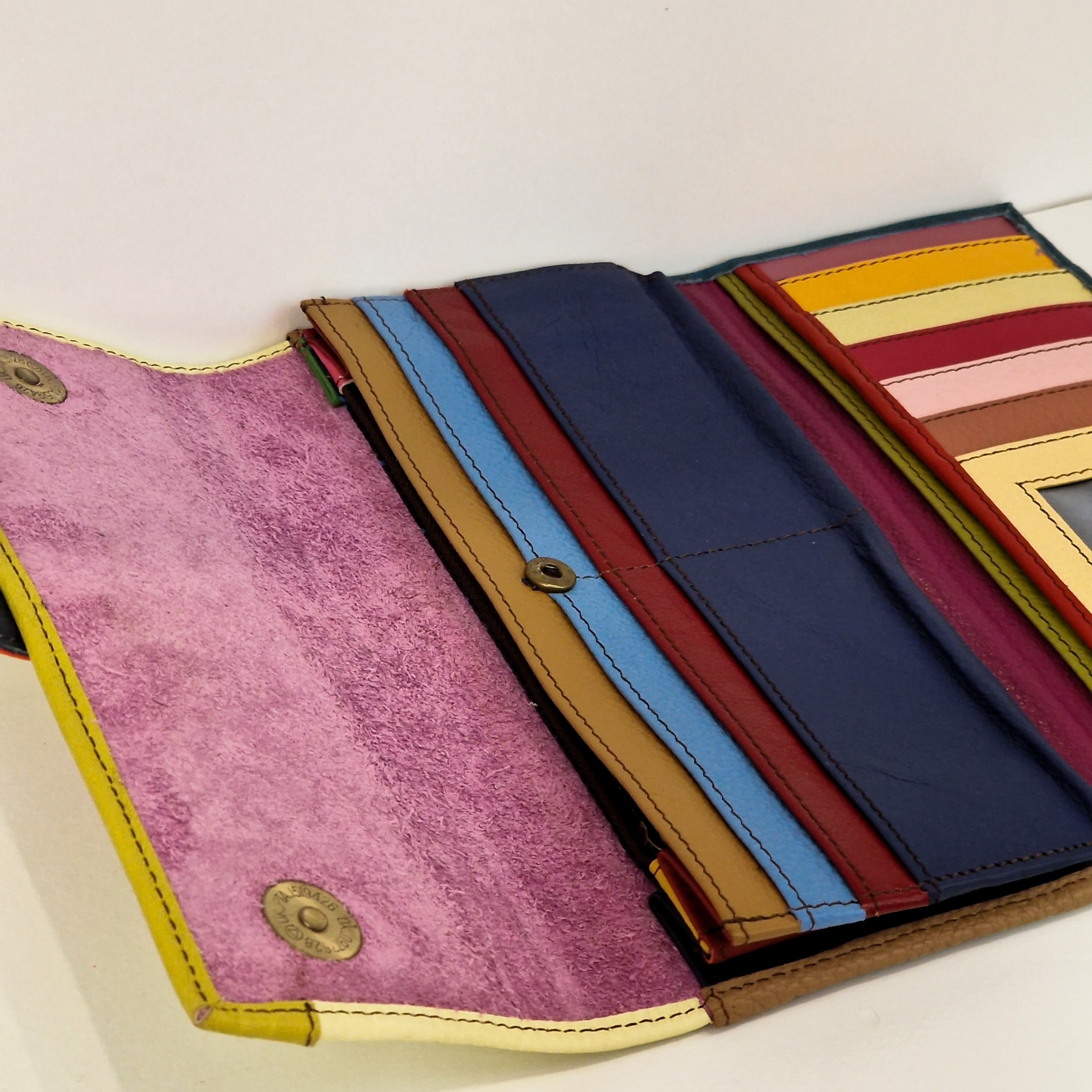 • Carteira de couro multicolorida aberta mostrando várias abas coloridas e interior em camurça rosa.