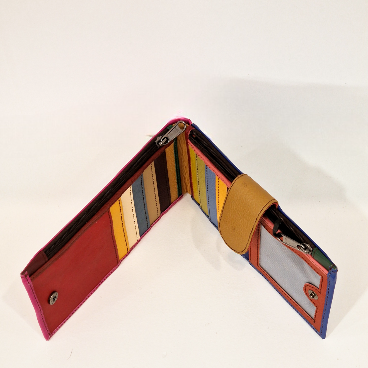 Carteira com compartimento para cartões, moedas e notas. Botão de fecho, 100% couro reciclado.