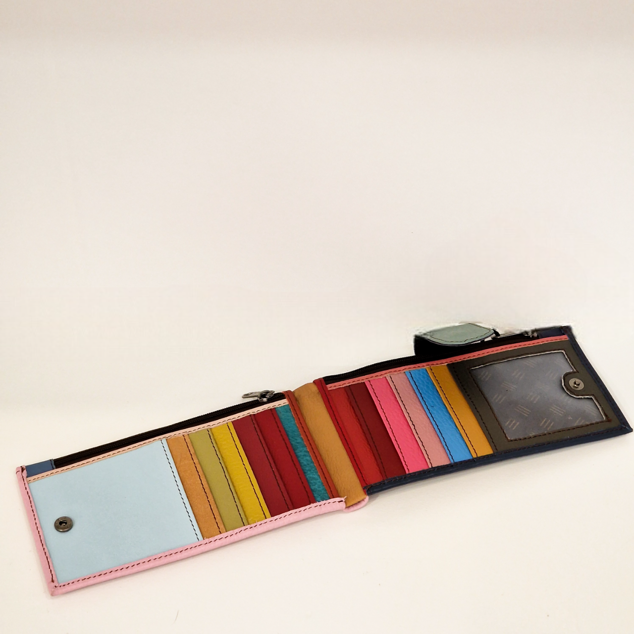 • Carteira colorida aberta em couro com fechos e compartimentos
