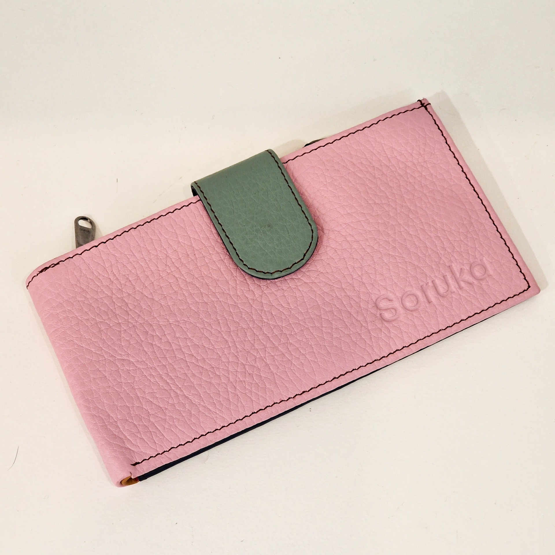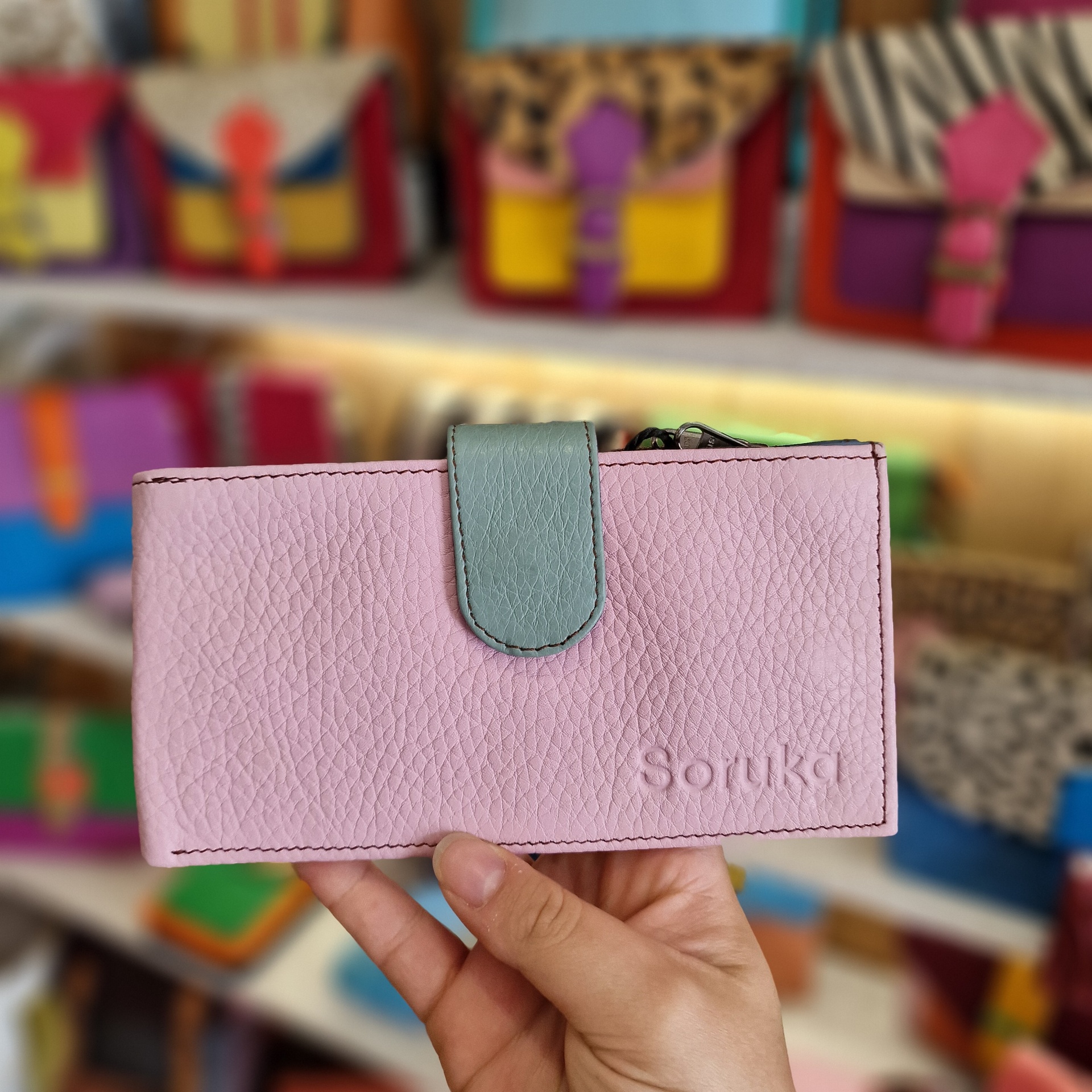 • Carteira de couro rosa com aba cinza e gravação 'Soruka'