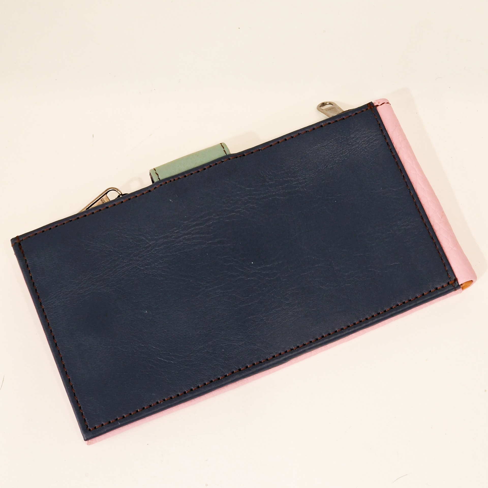 • Carteira azul escuro com bordas cor de rosa e detalhe verde