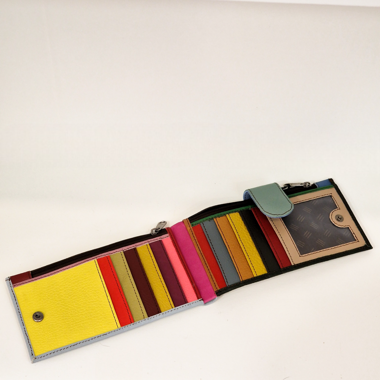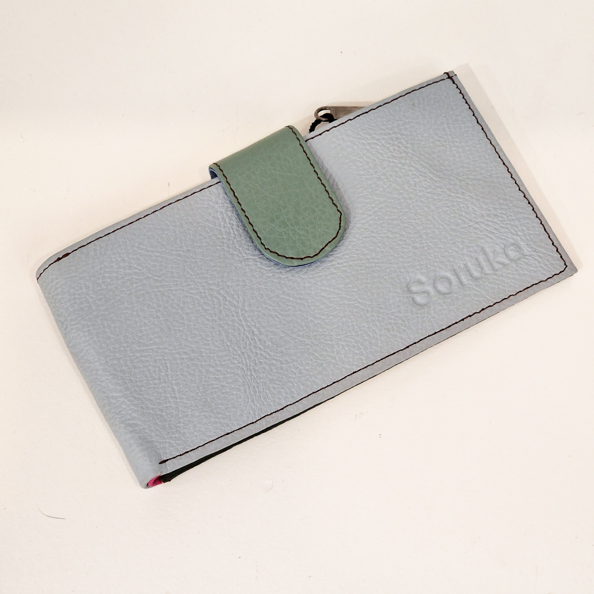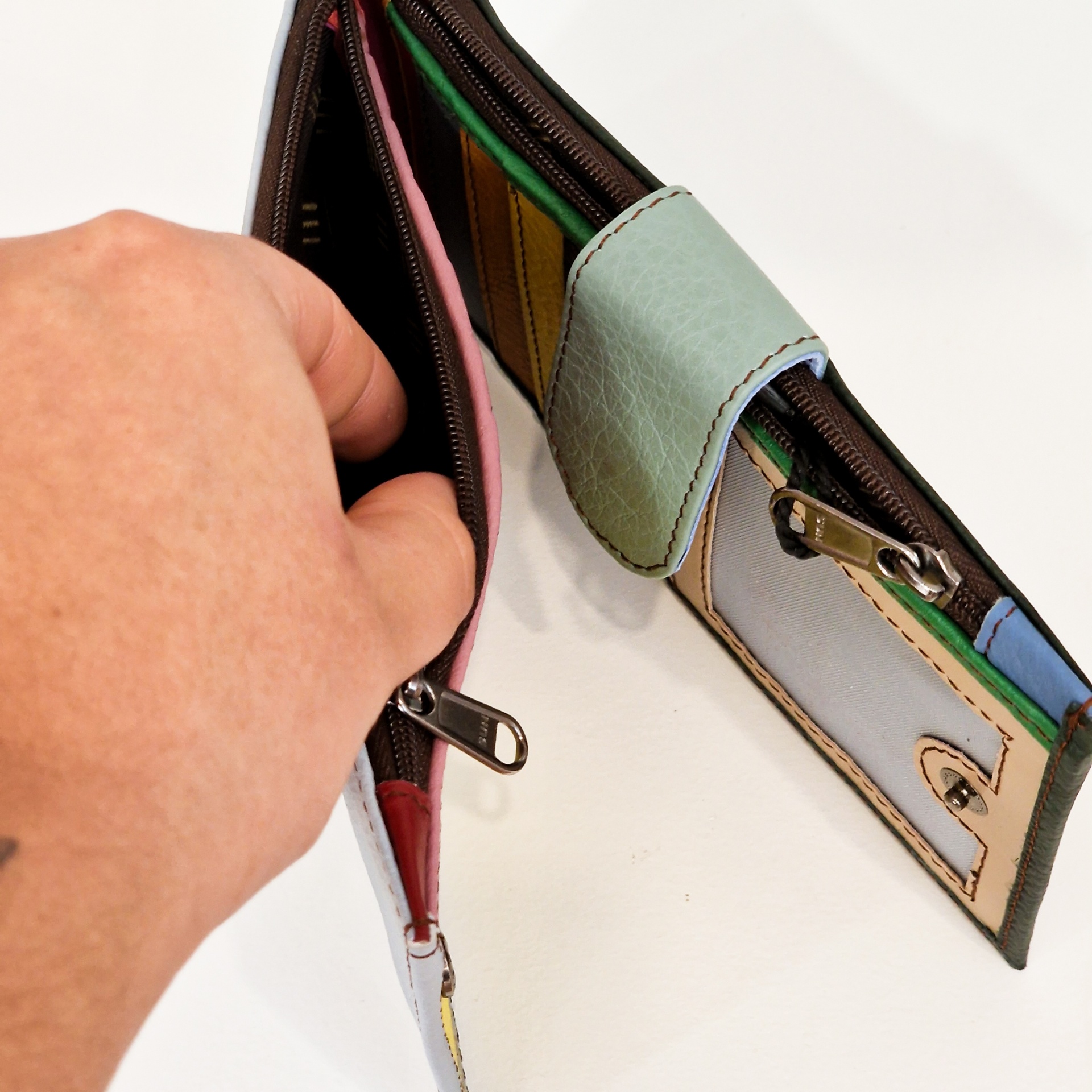 Carteira com compartimento para cartões, moedas e notas. Botão de fecho, 100% couro reciclado.