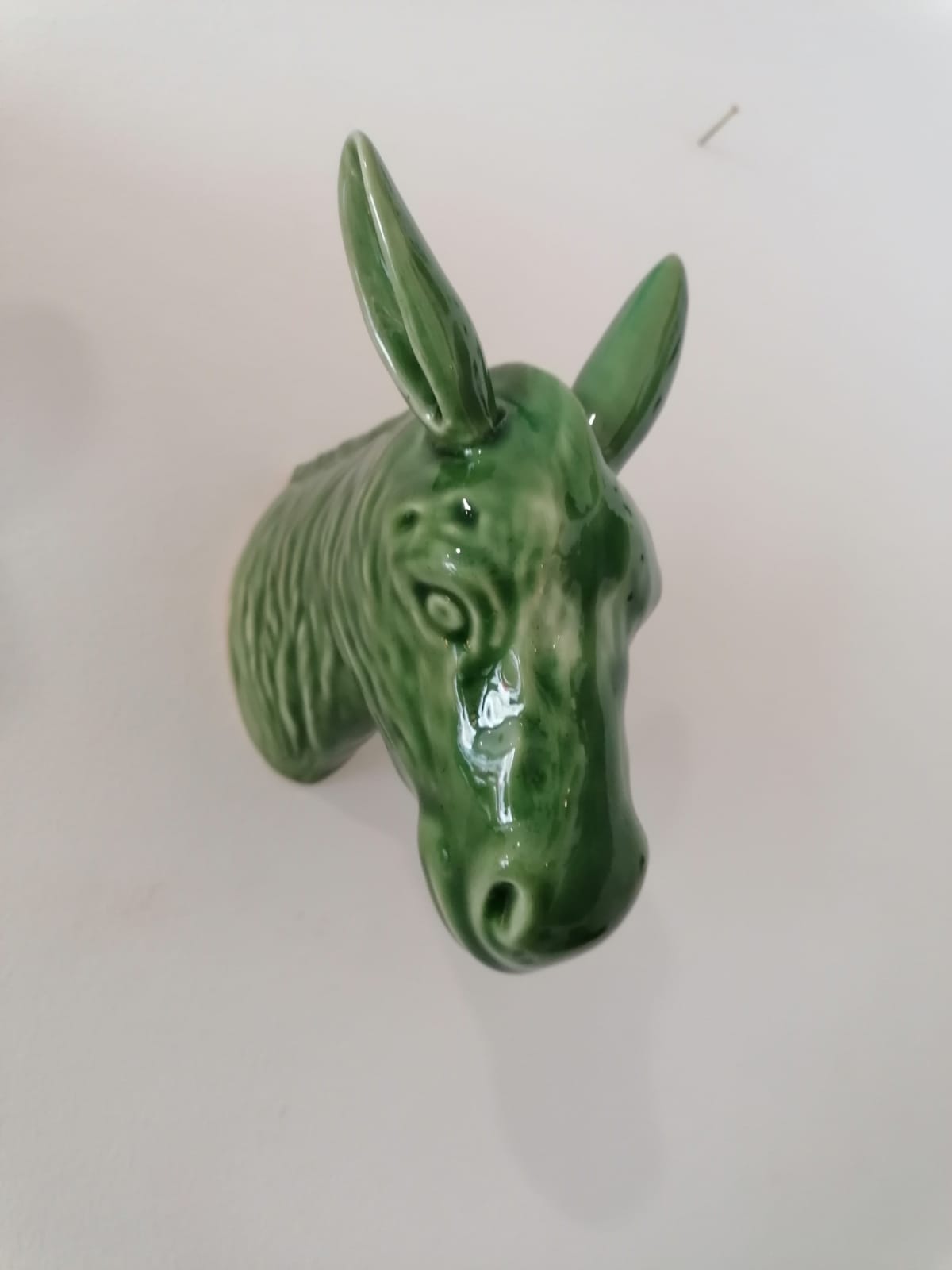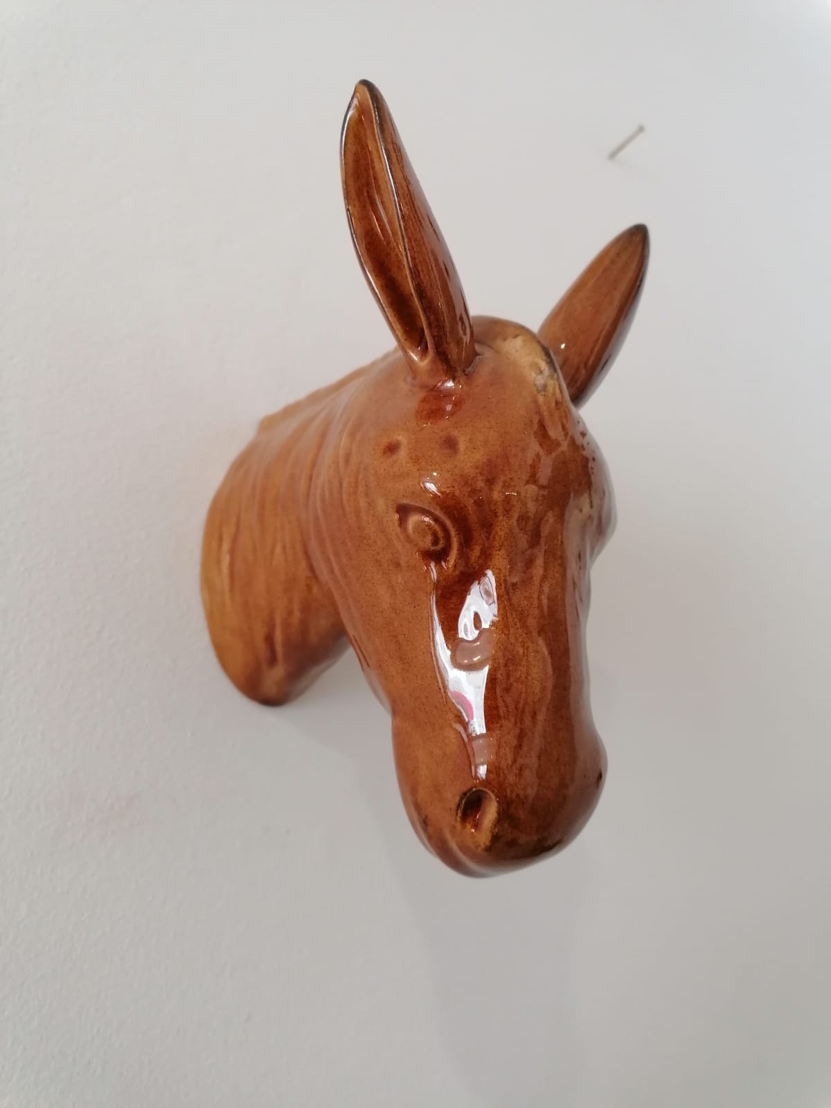 • Cabeça de burro decorativa em cerâmica castanha brilhante na parede