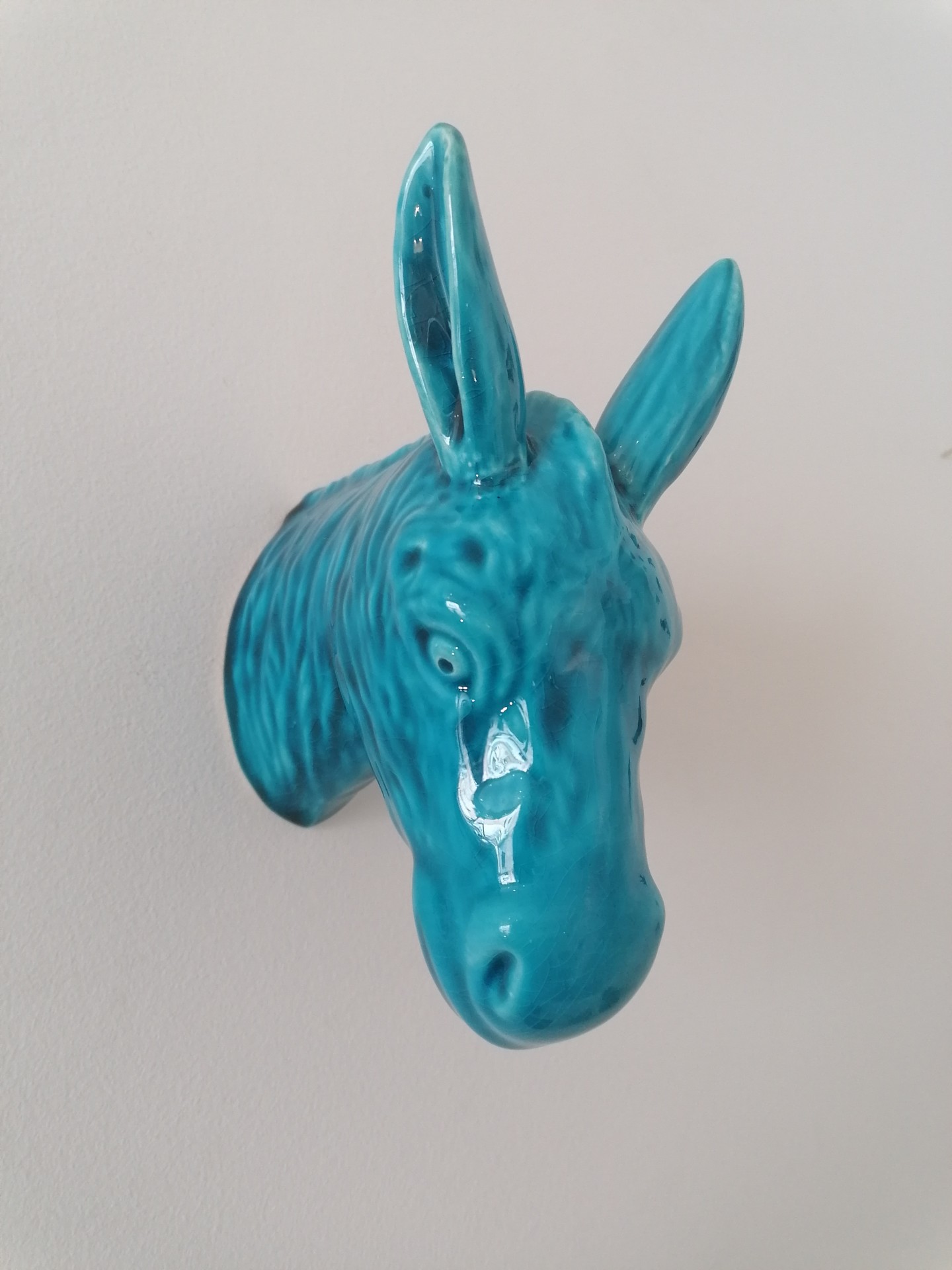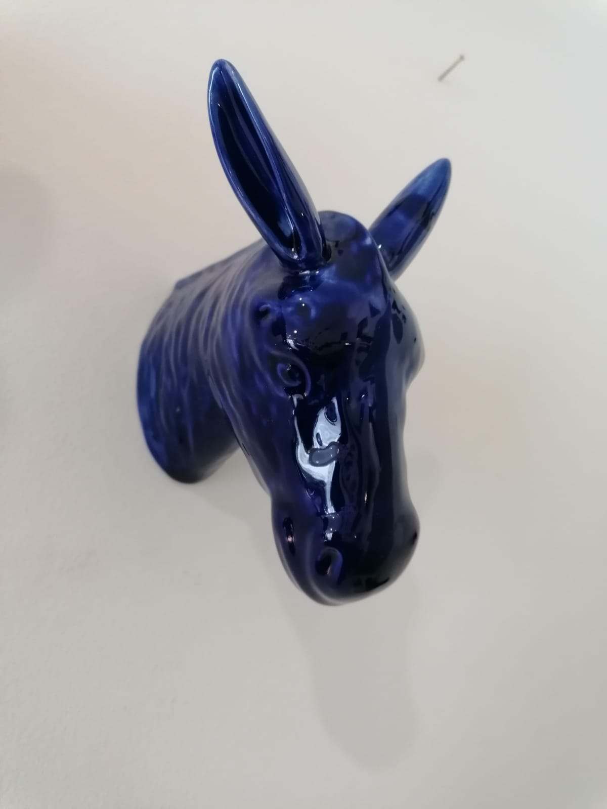 • Cabeça de burro decorativa azul em cerâmica na parede