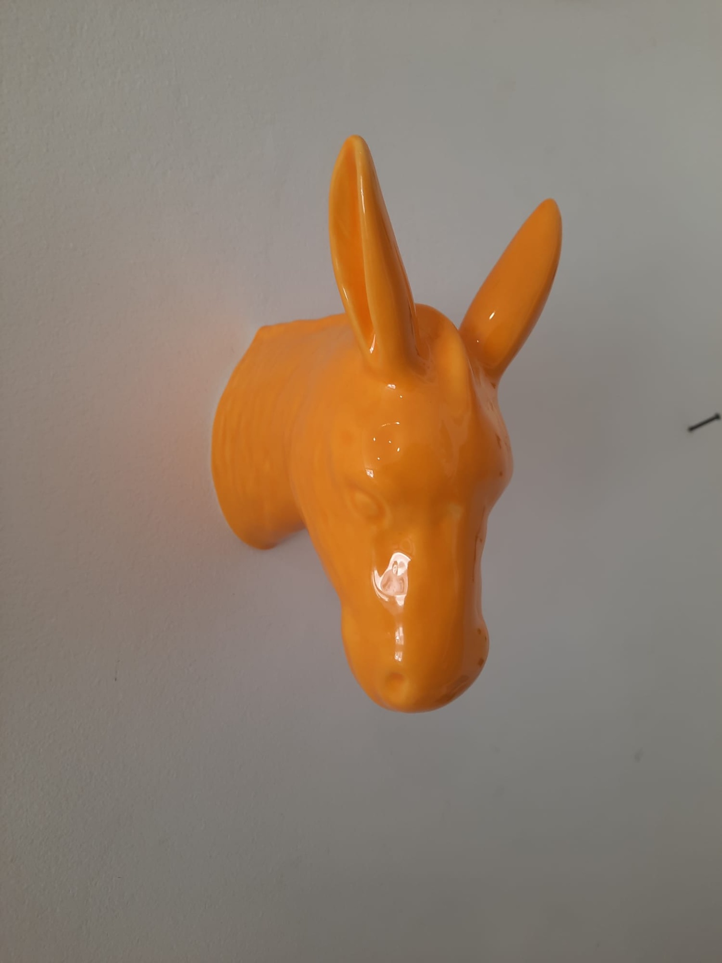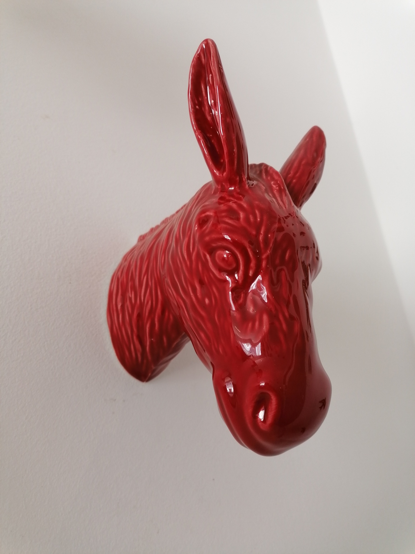 • Cabeça decorativa de burro em cerâmica vermelha brilhante na parede