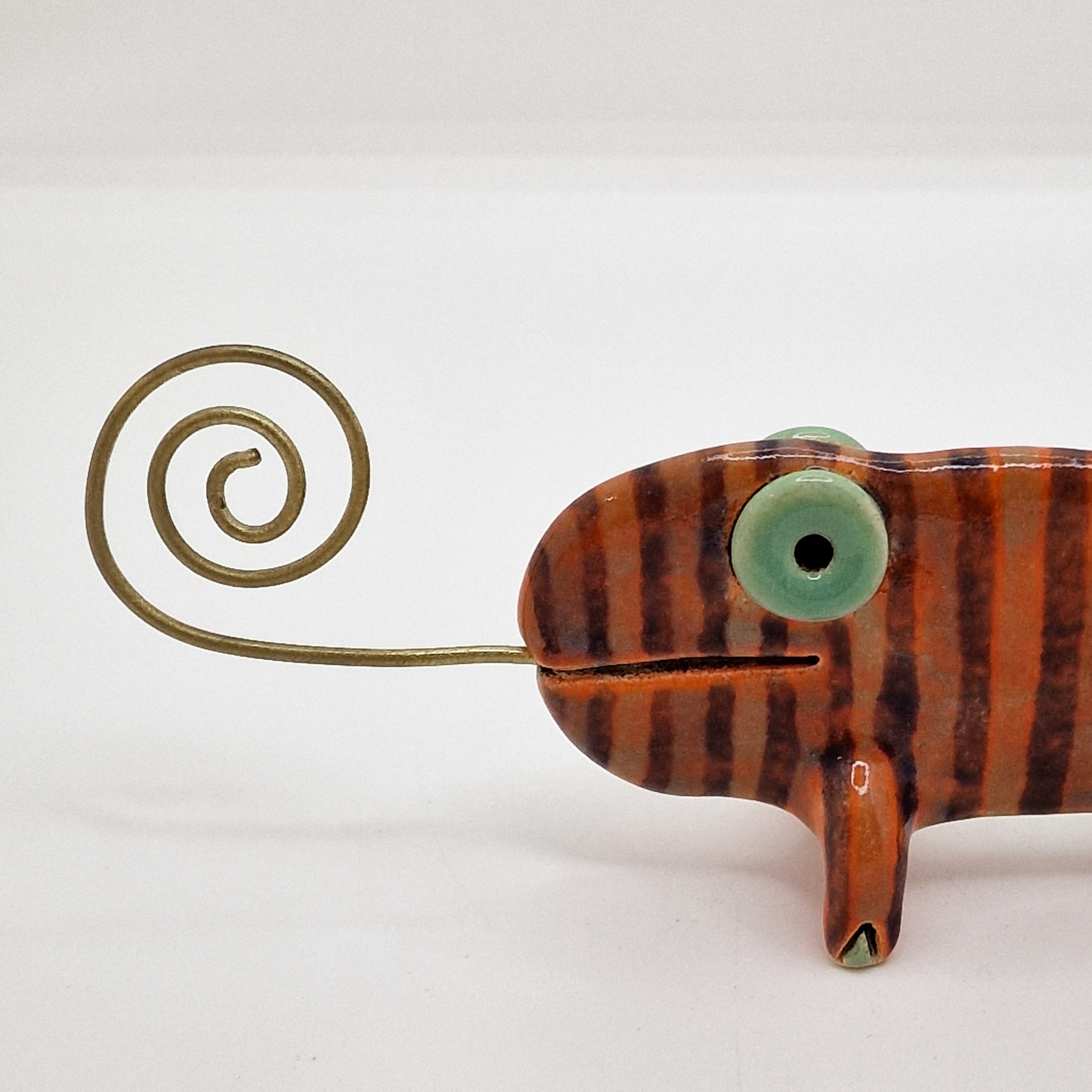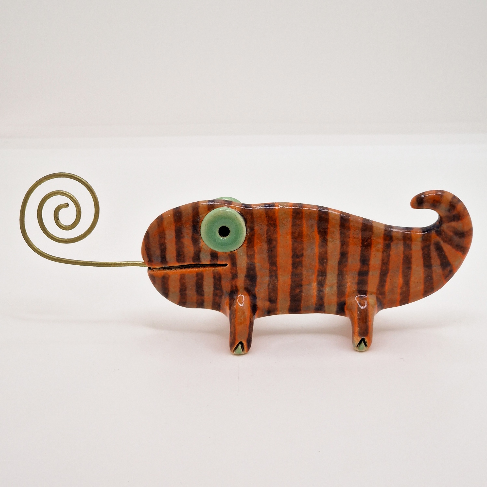 • Figura decorativa em cerâmica castanha com riscas pretas e língua de metal em espiral